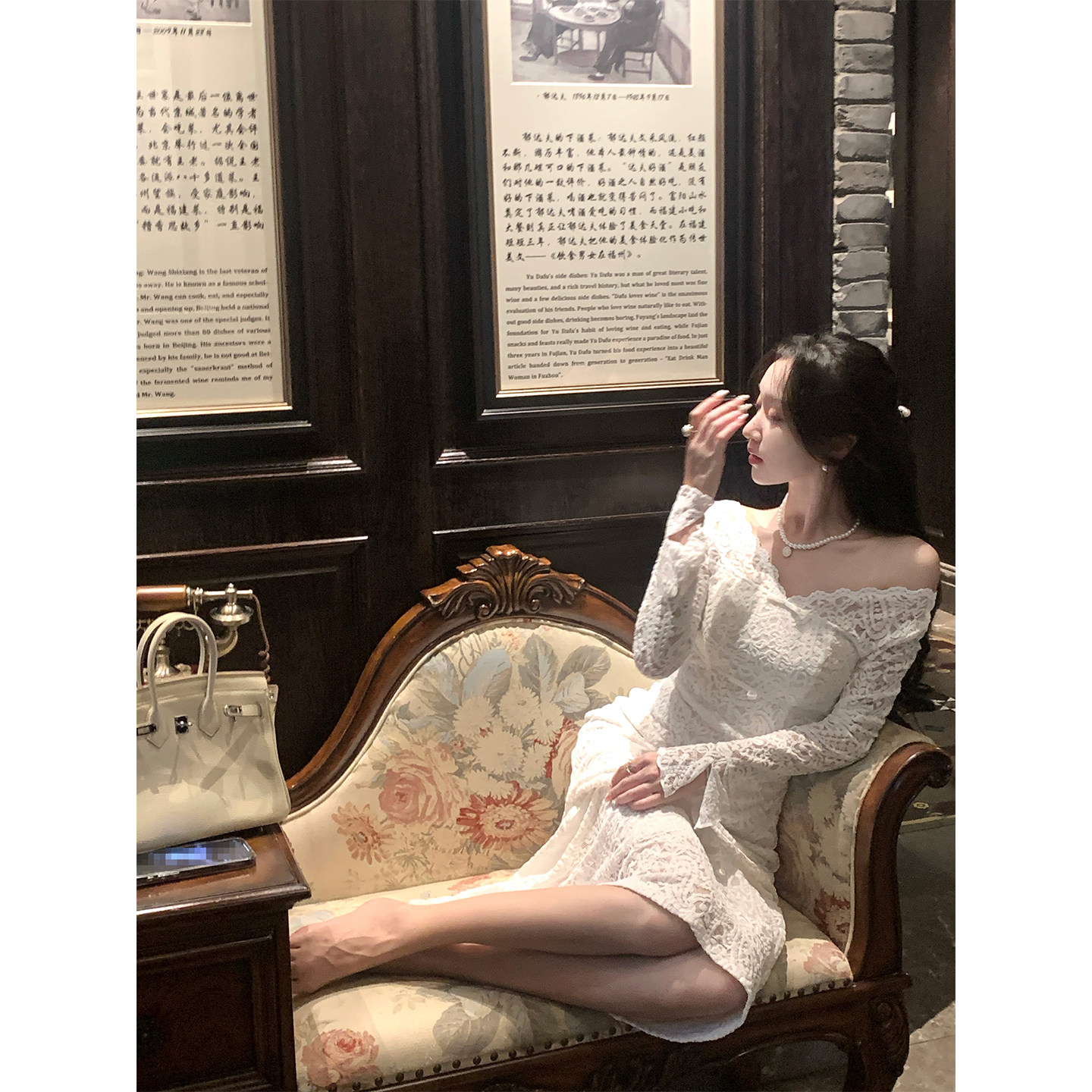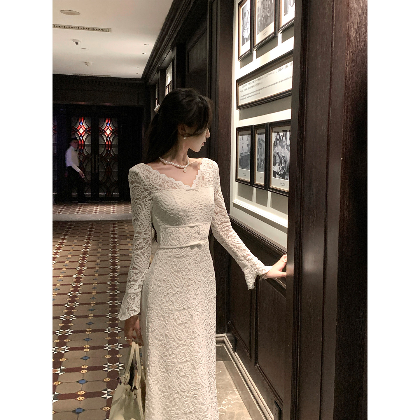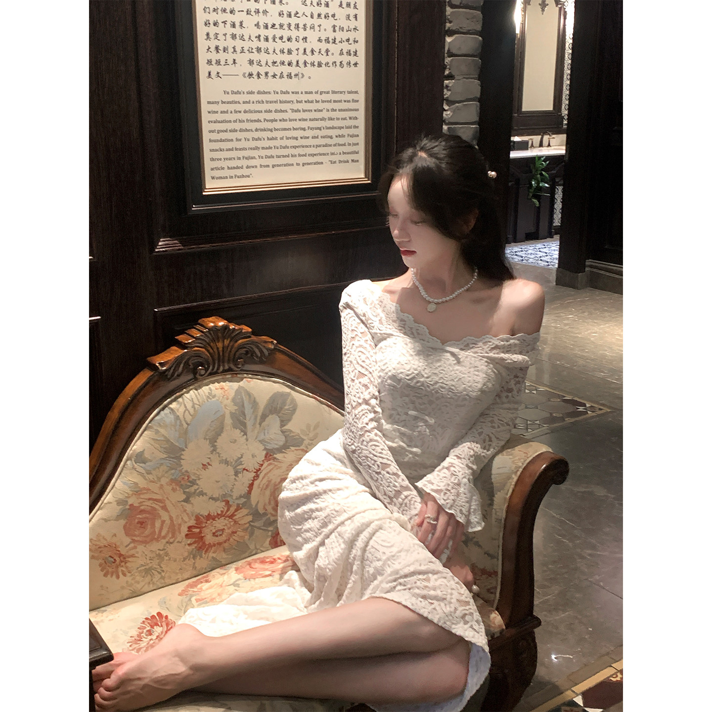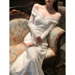 优雅气质修身 连衣裙女冬法式 鱼尾长裙 纯欲蕾丝一字肩长袖 韩语琳
