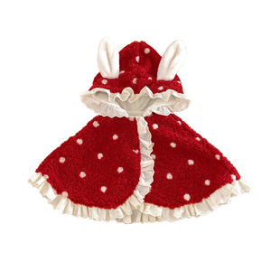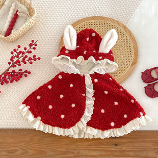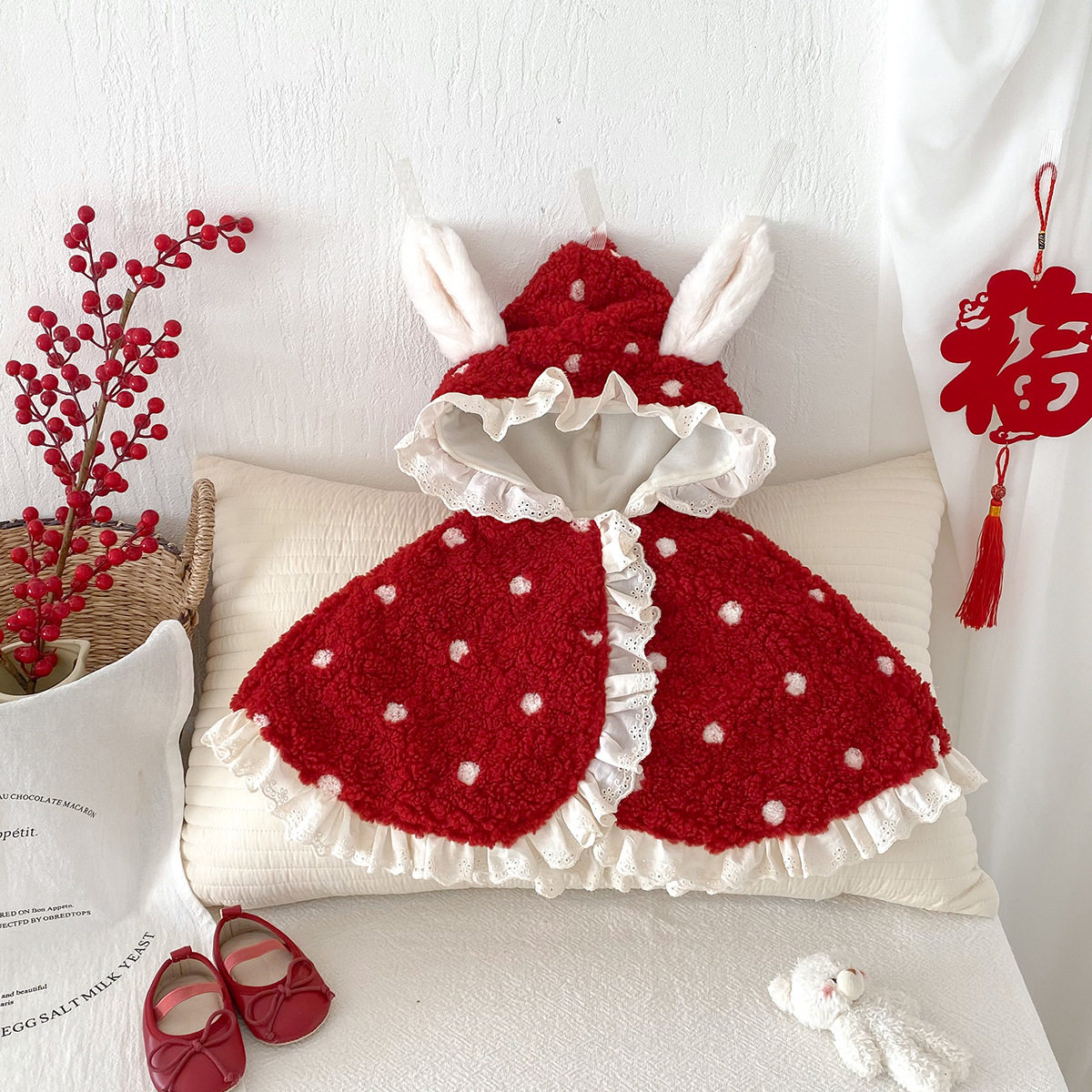 婴儿斗篷冬装 加绒加厚新生儿宝宝花边兔耳朵披风外出防风保暖外套