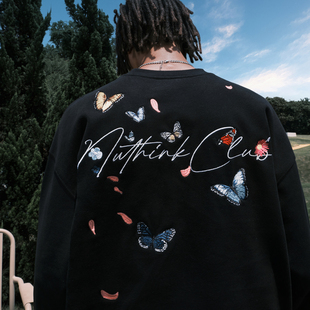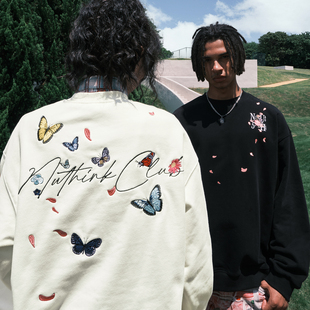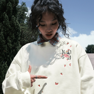 T恤衫 港风圆领卫衣男女春秋薄款 显白情侣上衣假两件oversize长袖