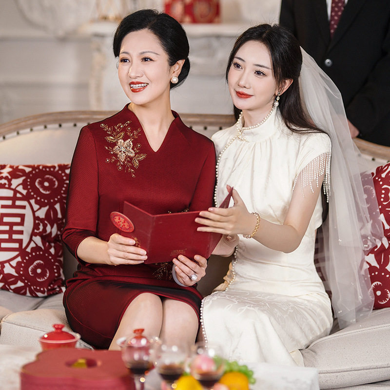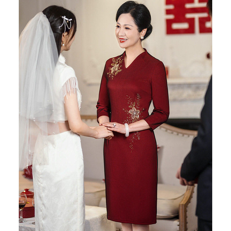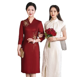 小个子妈妈喜服婚宴气质喜婆婆婚宴装 酒红色丈母娘旗袍 改良时尚