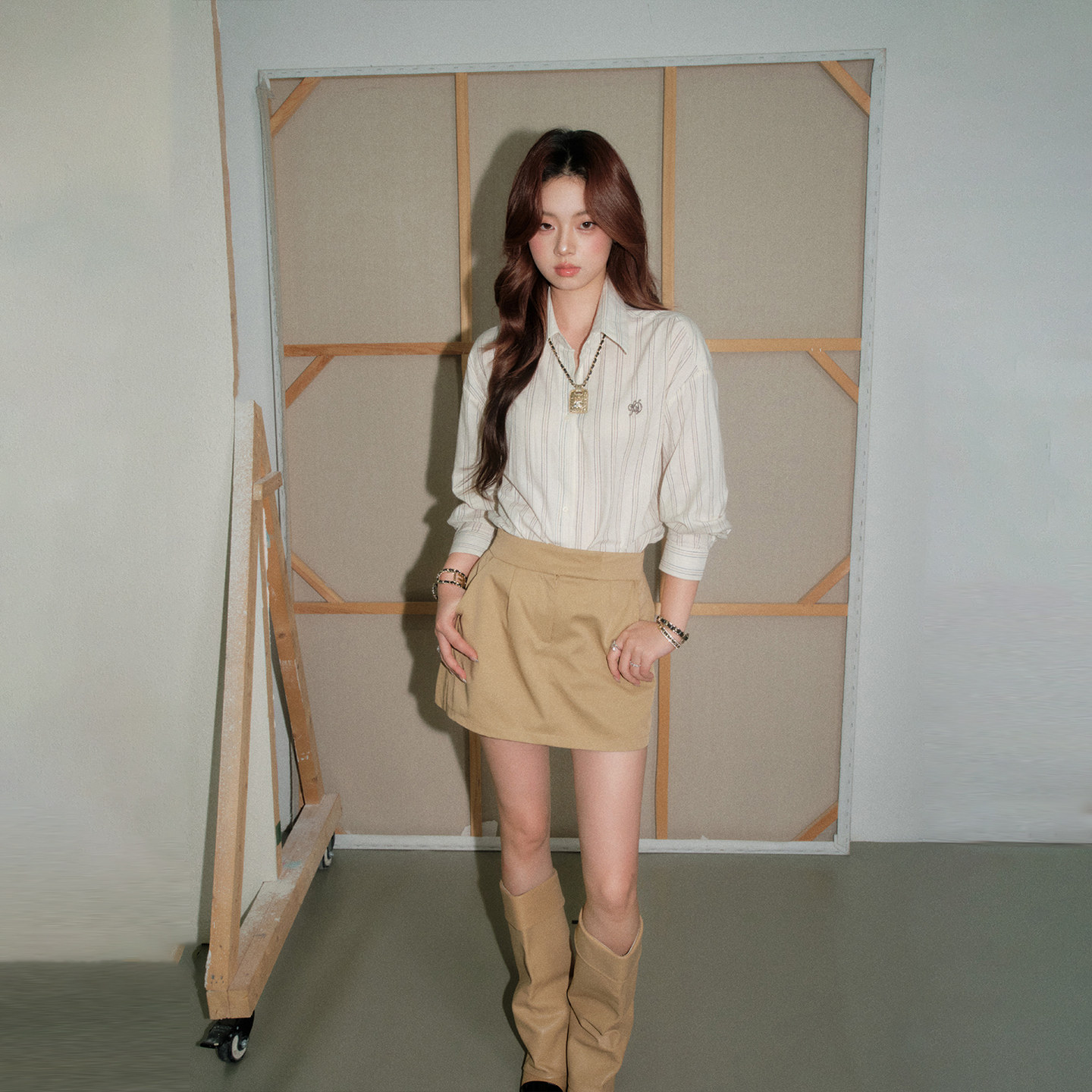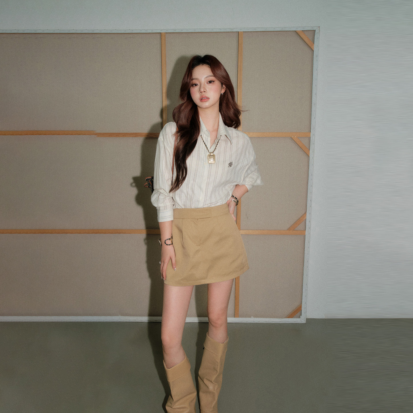 现货 复古甜美文艺长袖 OLIVIA 女秋季 开衫 DUO翻领米白条纹衬衫