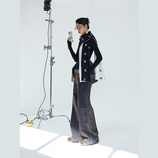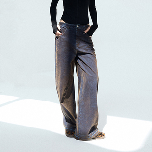 女冬设计感长裤 铁锈蓝光泽感中低腰植绒牛仔裤 复古做旧 ourhour