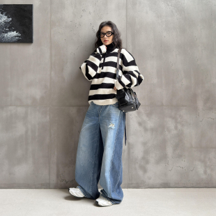 WANG双腰阔腿女牛仔蓝叠穿宽松长裤 LEDIM 2026春新款 明星同款