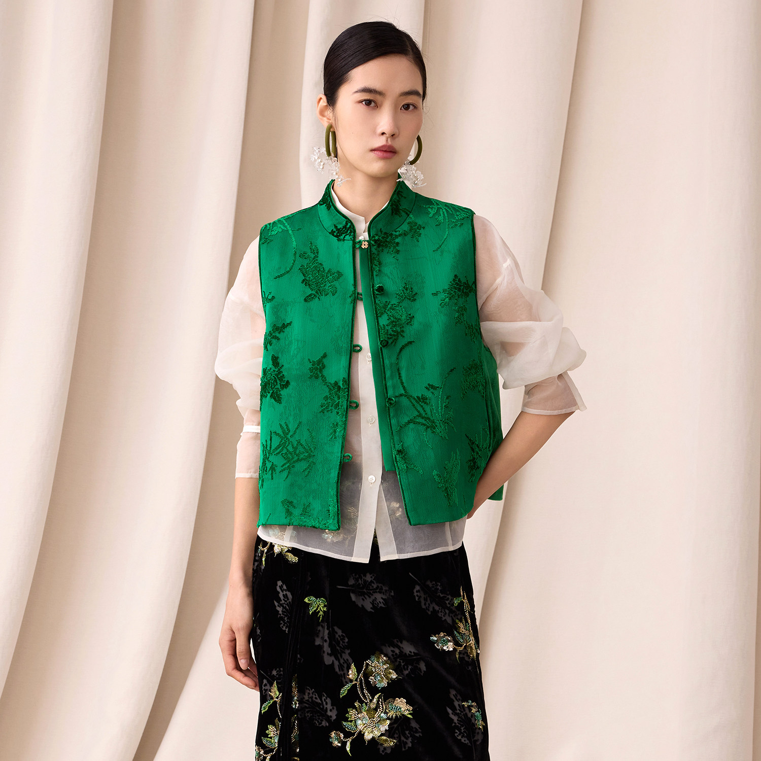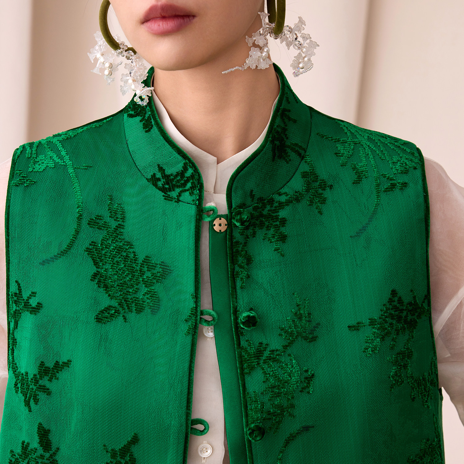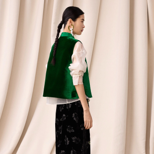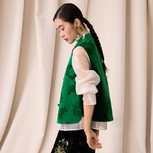 立领割绒提花丝绒马甲女新中式 新款 盘扣背心坎肩 芮竹 如意连云