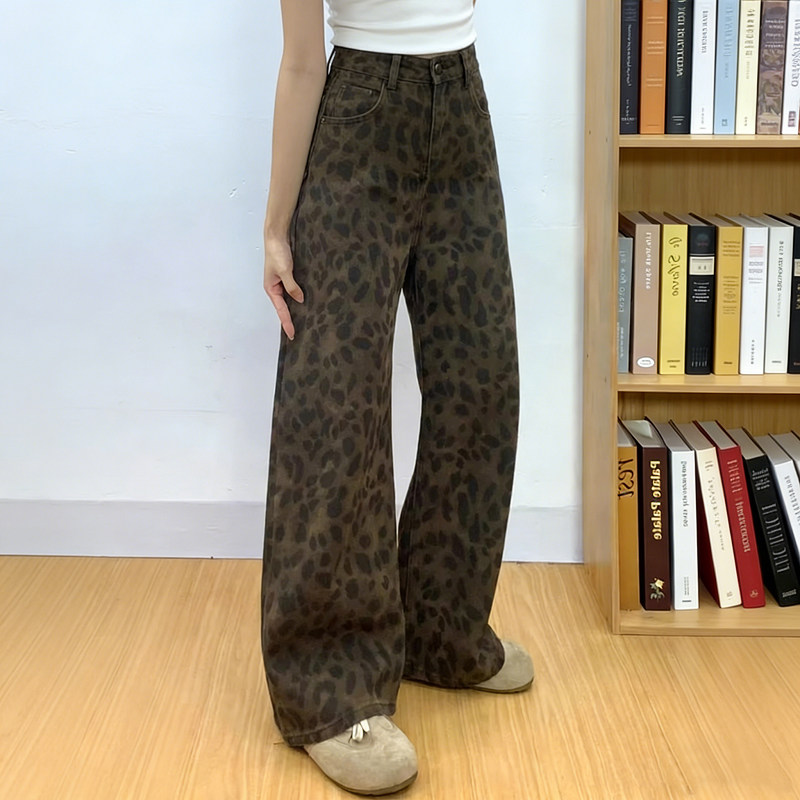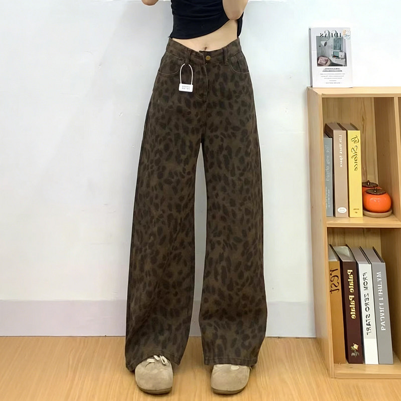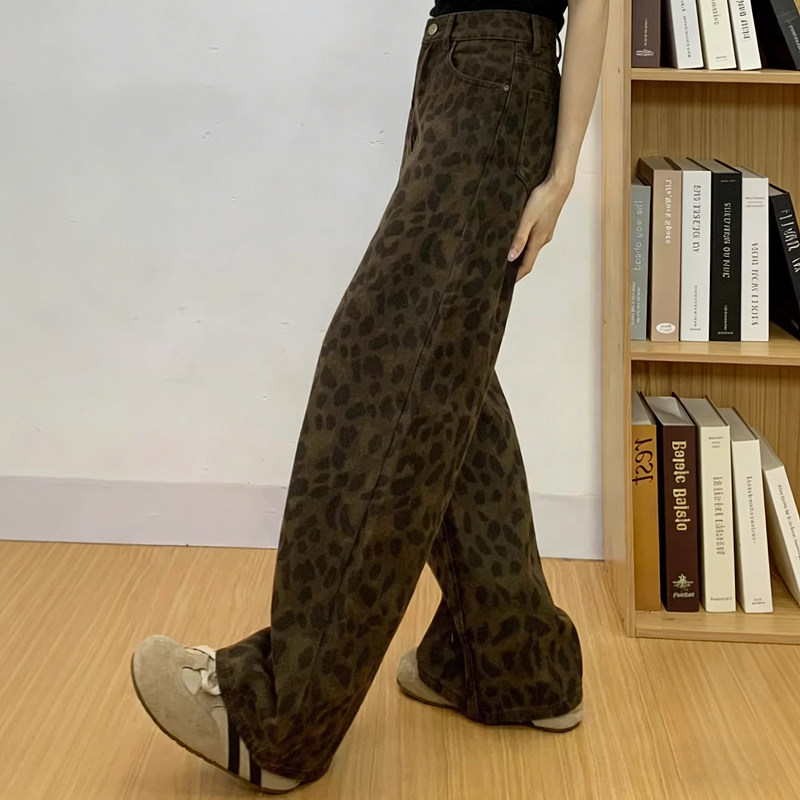 145小个子宽松显瘦八分拖地休闲长裤 新款 150 女春季 复古豹纹牛仔裤