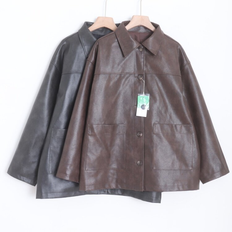 D15082日单新款 PU皮衣外套 贵牌单排扣翻边领宽松直筒女休闲中长款