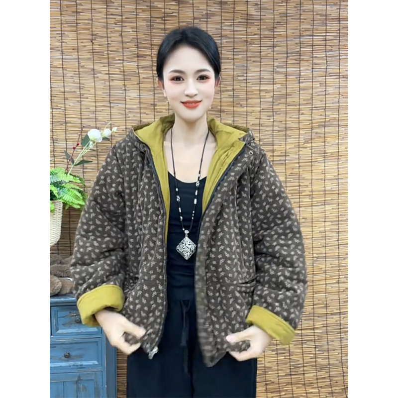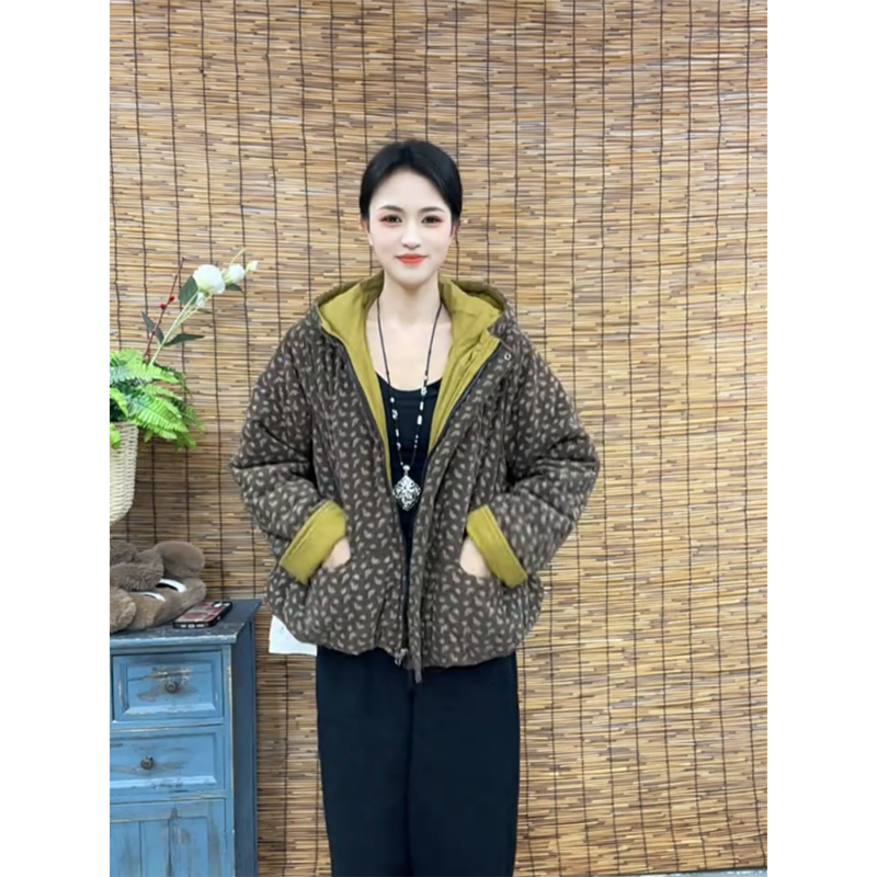宽松显瘦连帽保暖棉服外套 新款 时尚 灯芯绒印花加厚棉衣女2025冬季