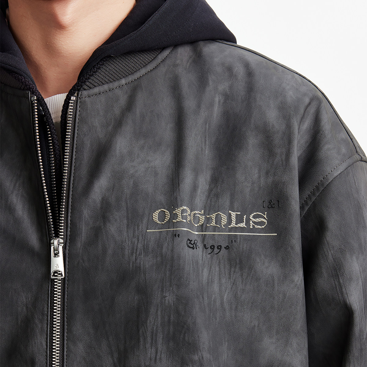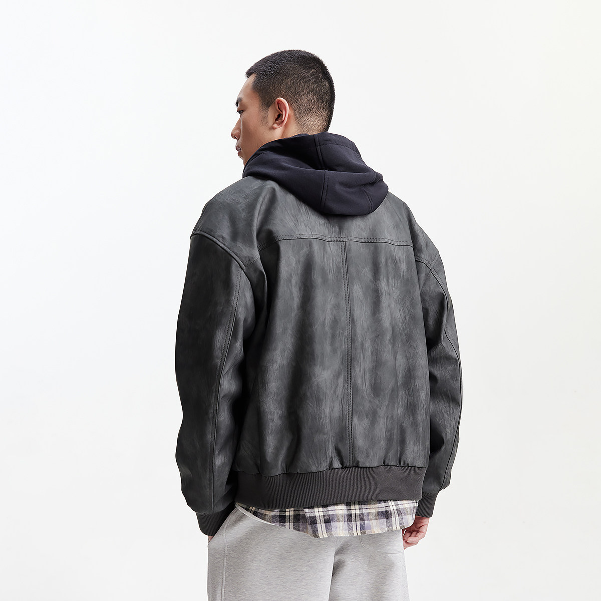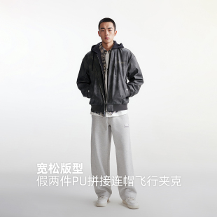 美式 新款 复古假两件PU连帽棒球领飞行夹克外套 春季 杰克琼斯男装