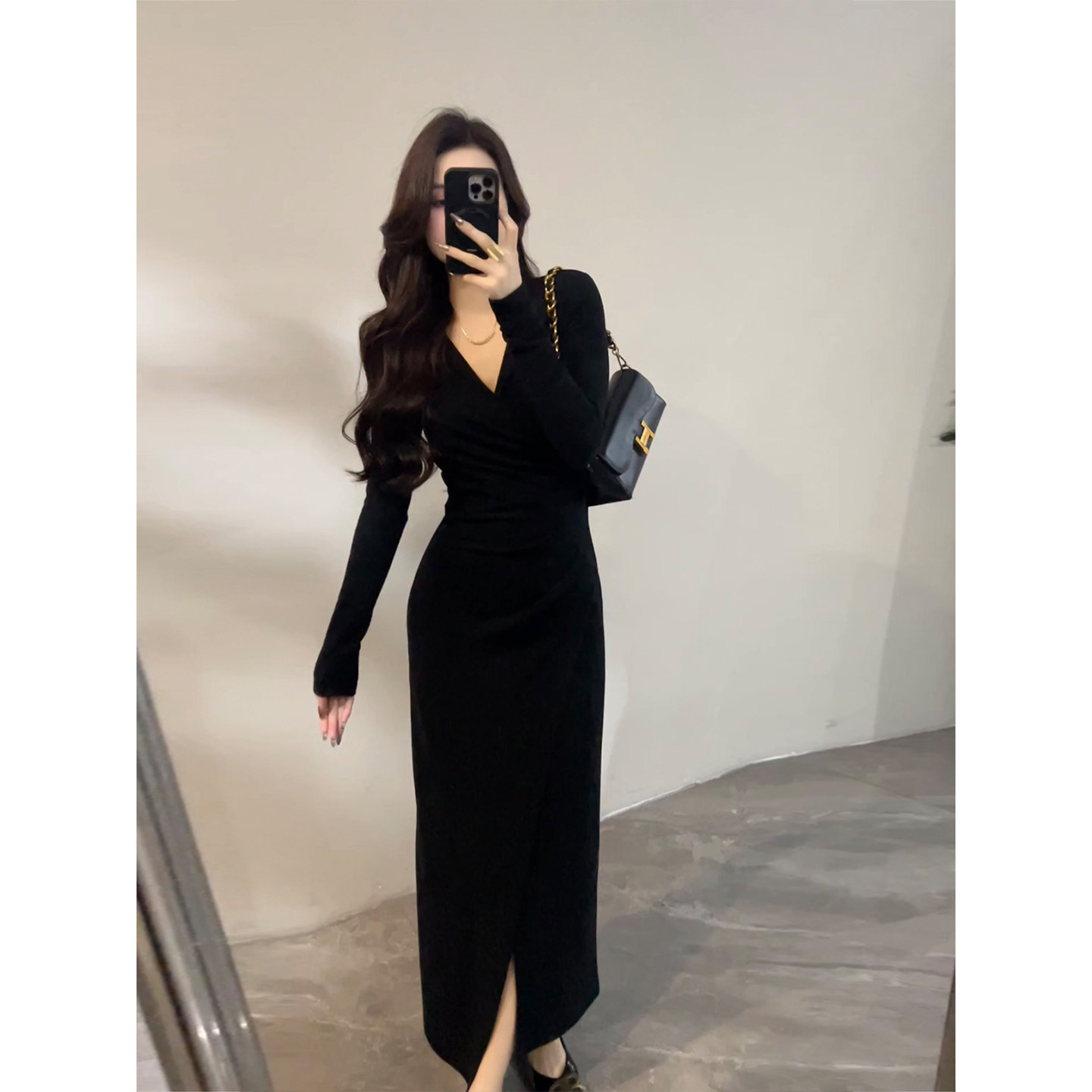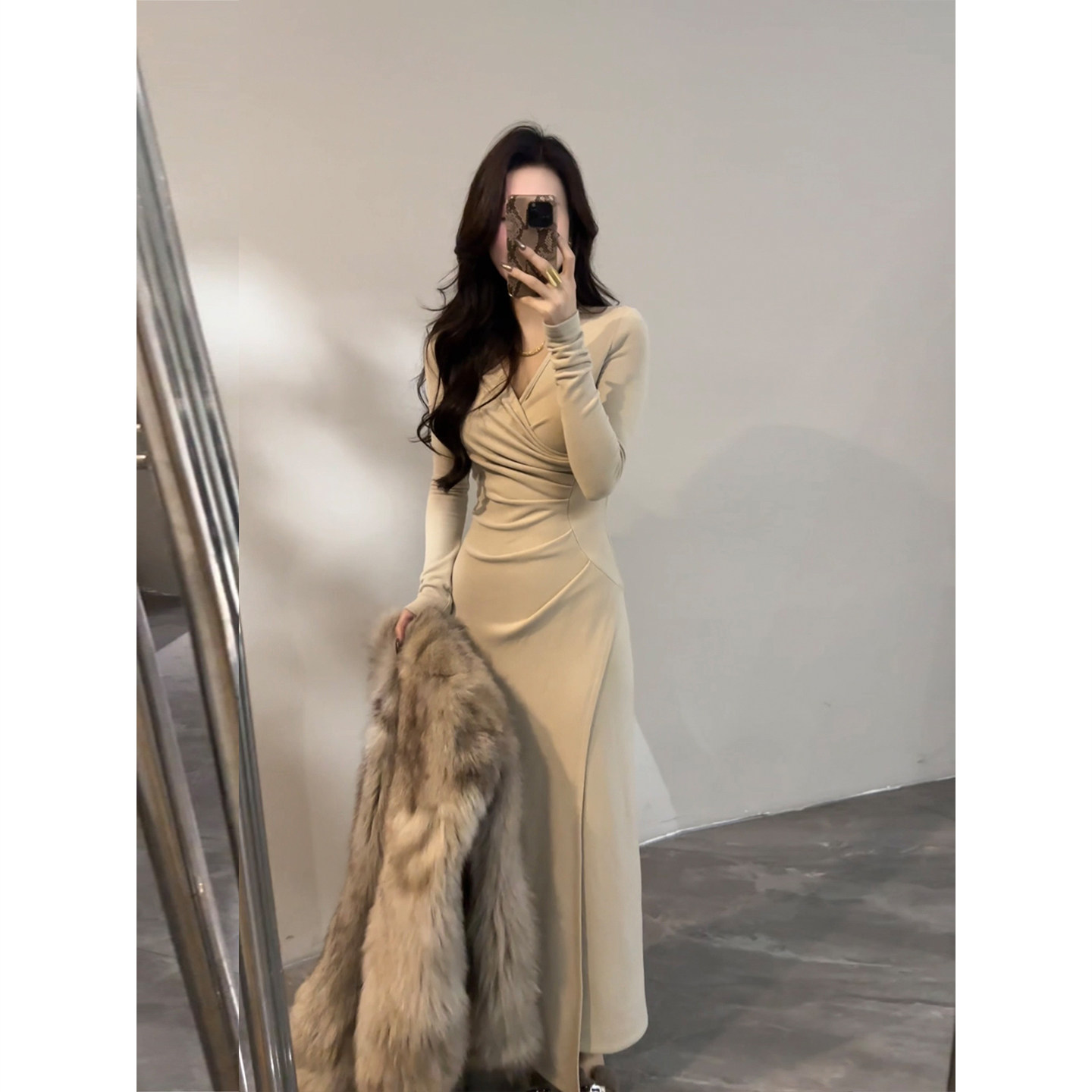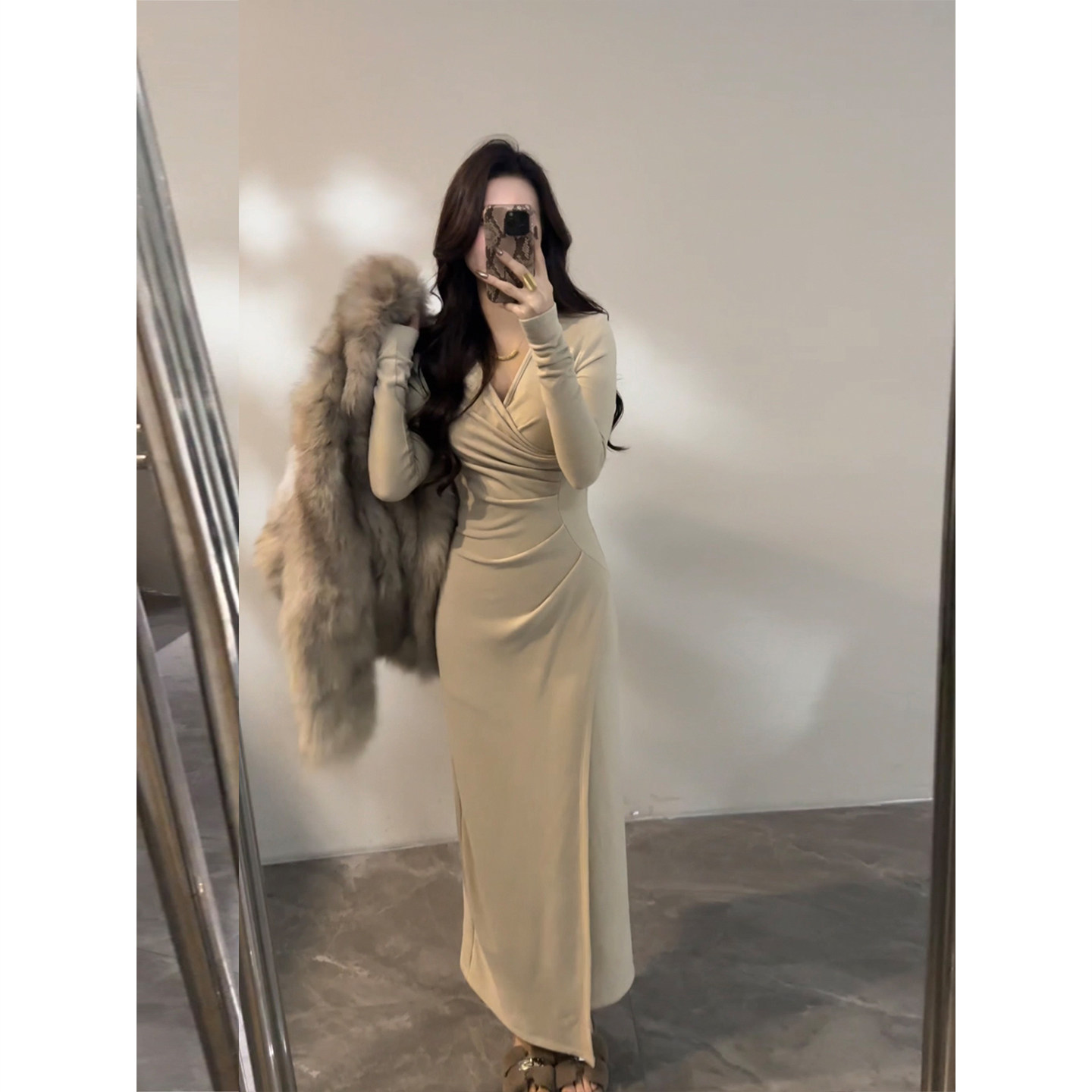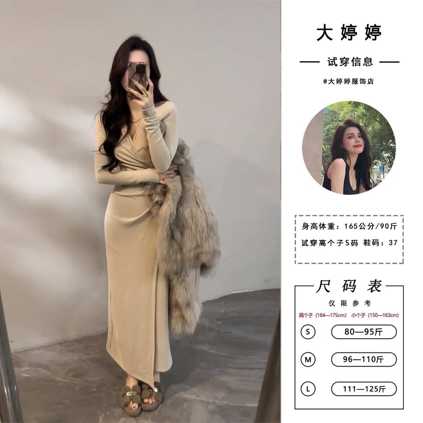 连衣裙长裙冬季 显瘦长袖 小众褶皱连衣裙DT1799 V领长袖 大婷婷