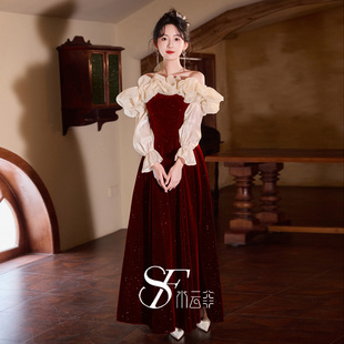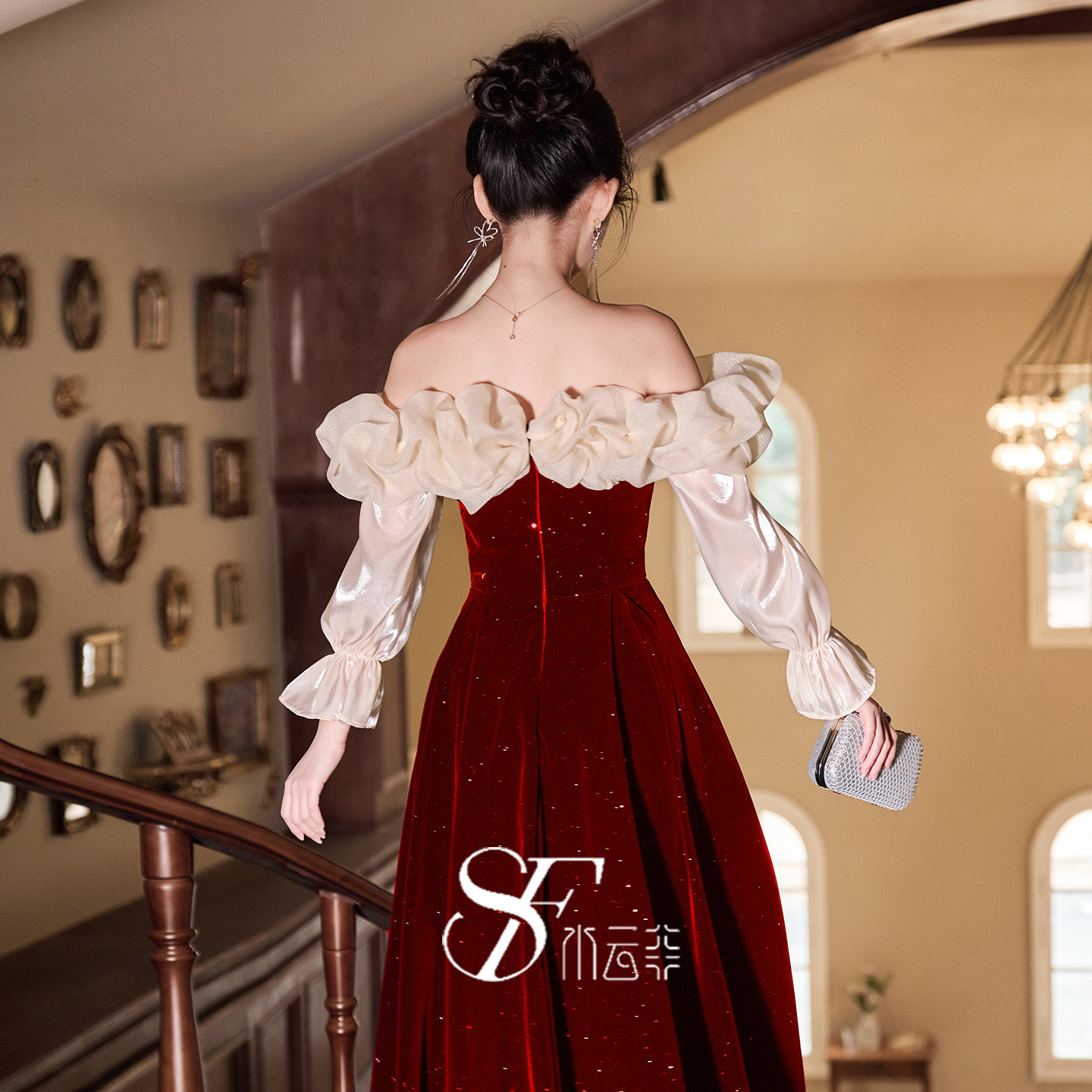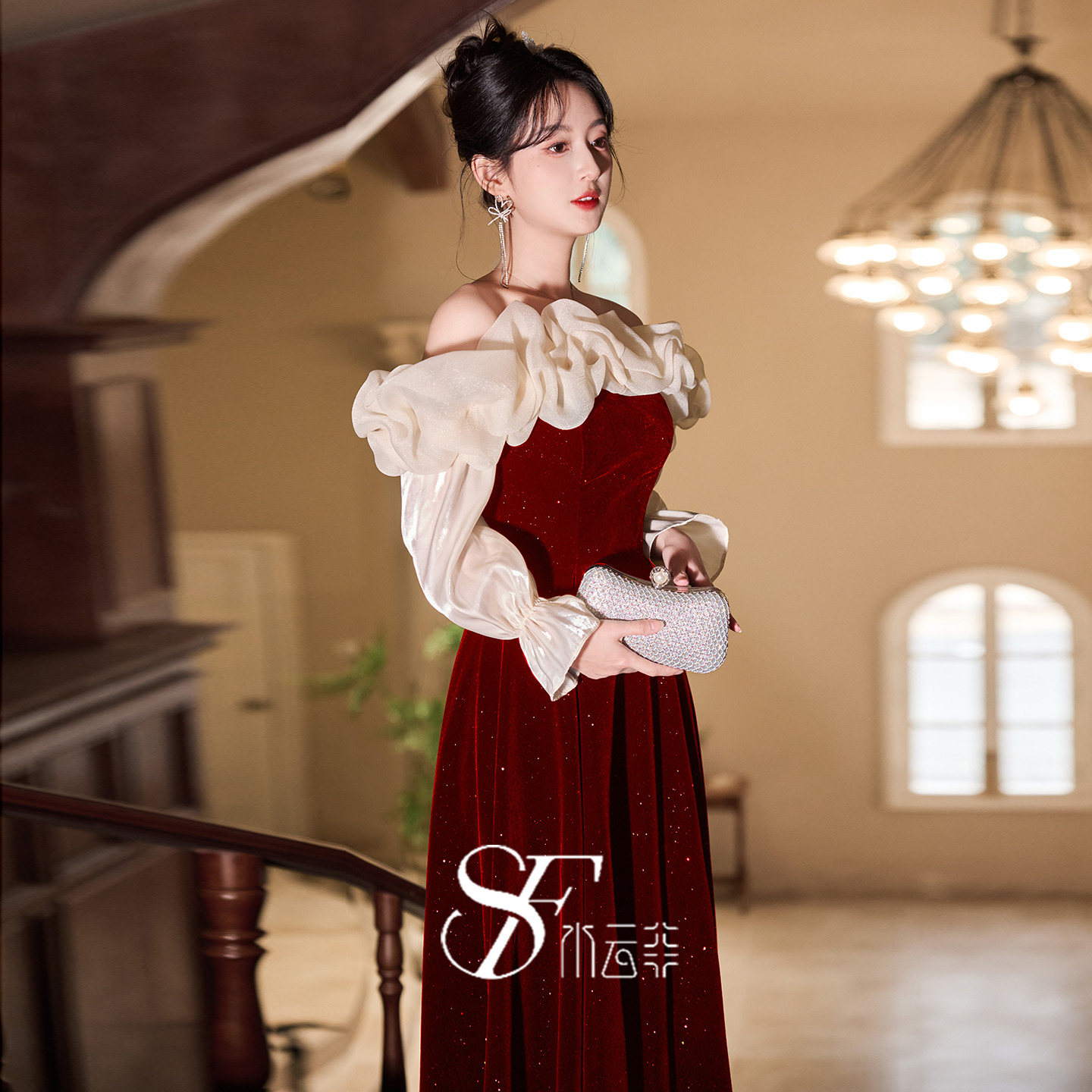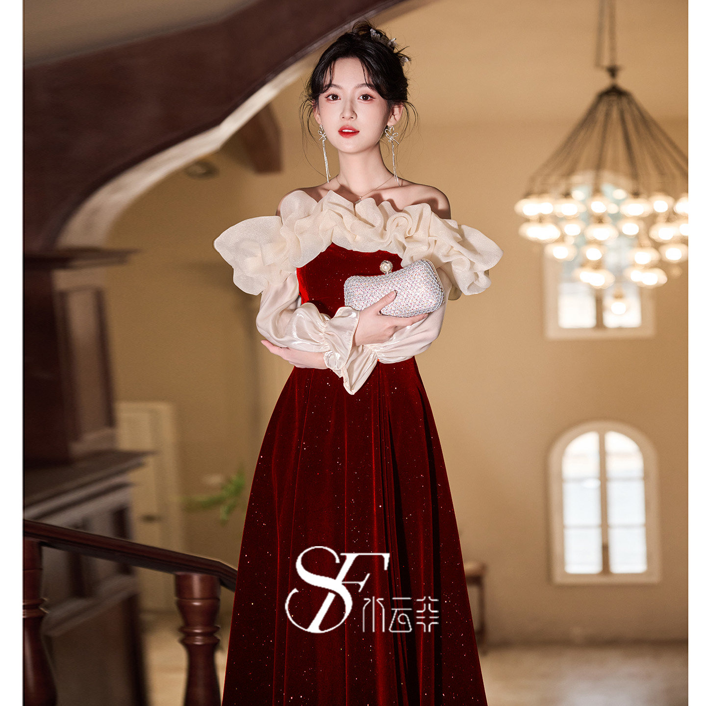敬酒服新娘冬季 场合现代风绝美订婚礼服裙女 一字肩丝绒高级感正式