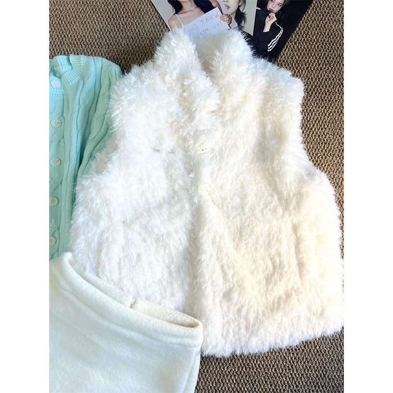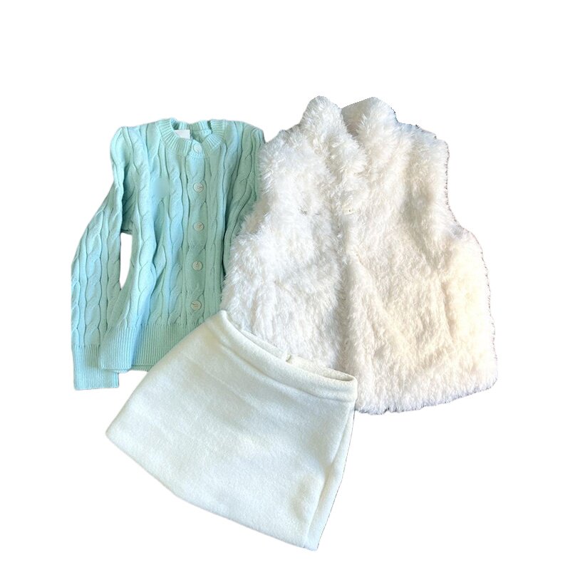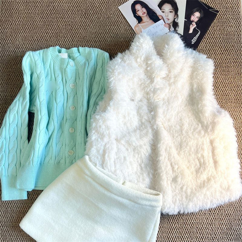 搭配毛毛马甲背心两件套装 法式 气质温柔学院风薄荷绿麻花毛衣开衫