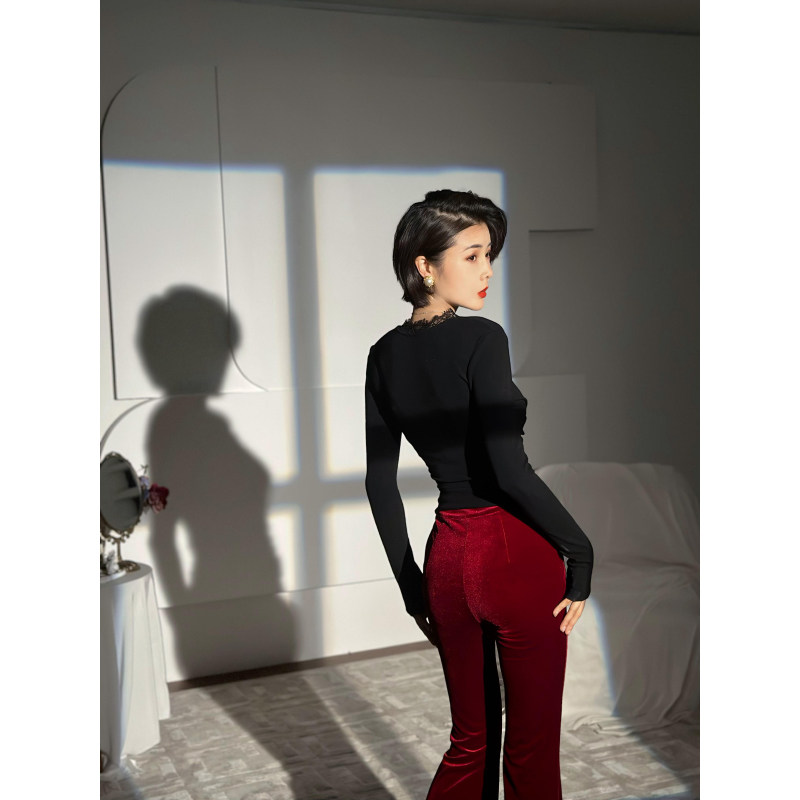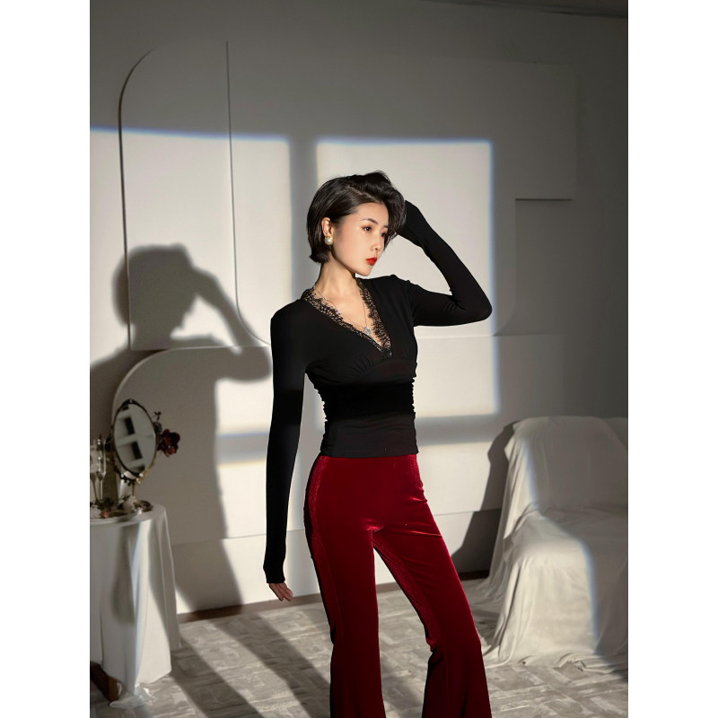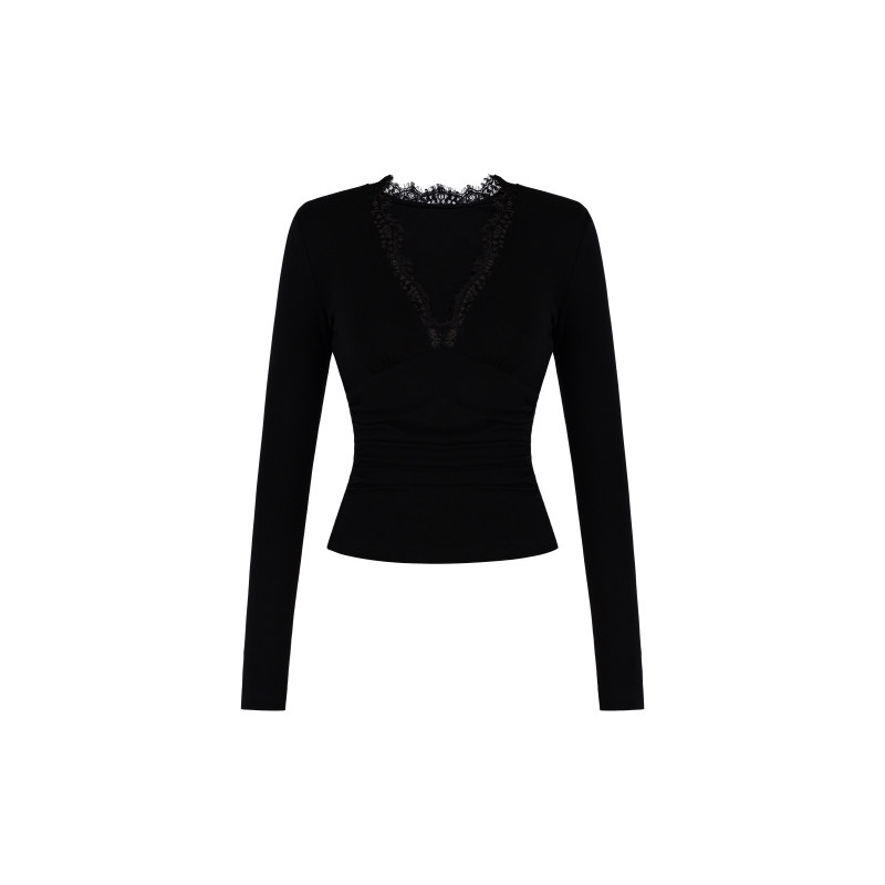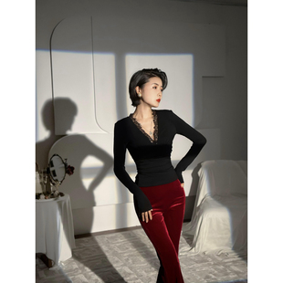 上衣 花边V领长袖 XULU原创气质打底衫 黑色百搭修身