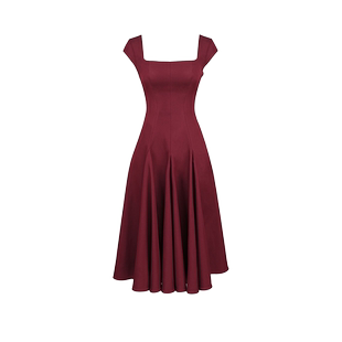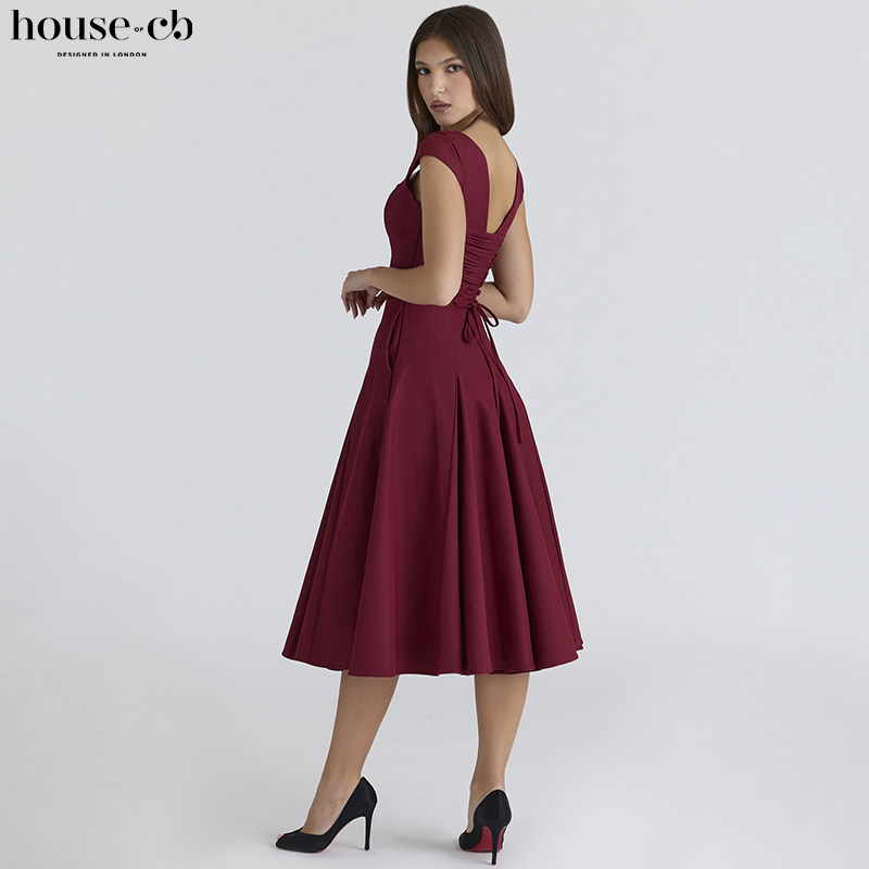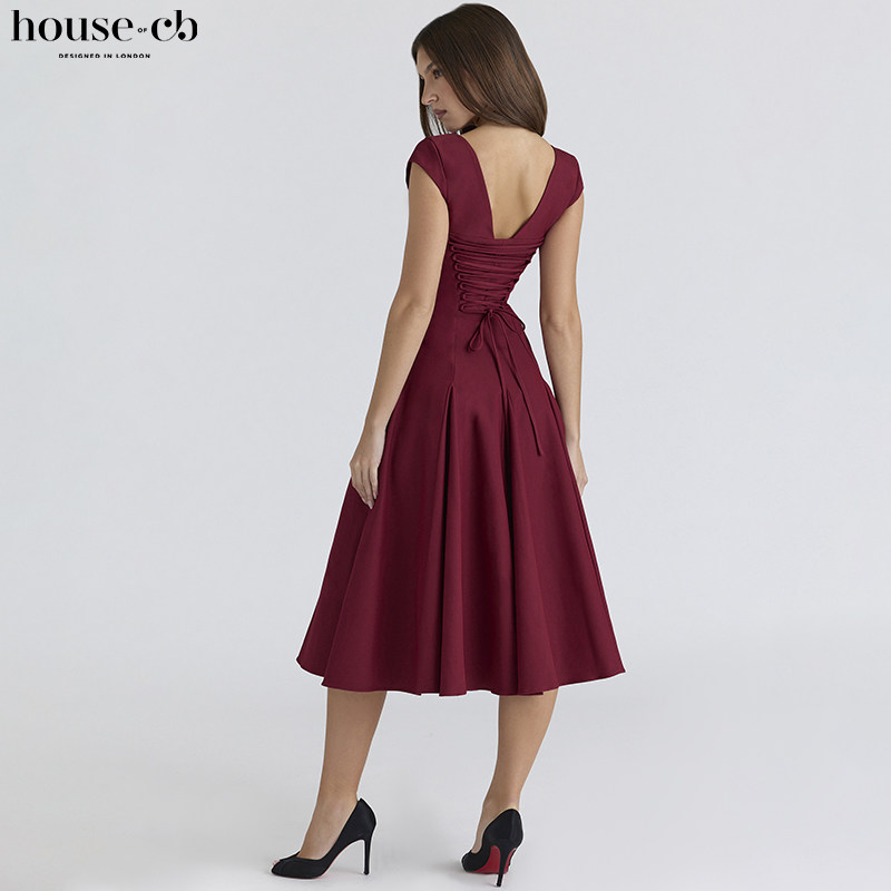 House CB大方优雅酒红色蕾丝后背斜纹中长连衣裙Raisa
