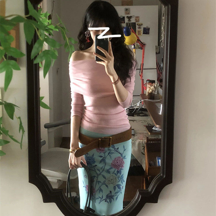 女小众温柔风一字领上衣两件套潮 花鸟印花设计半身裙套装 秋季 新款
