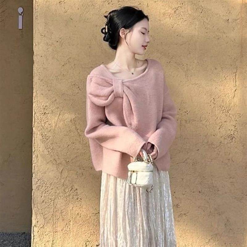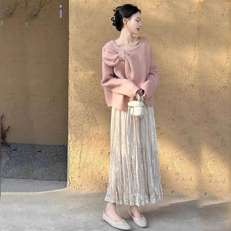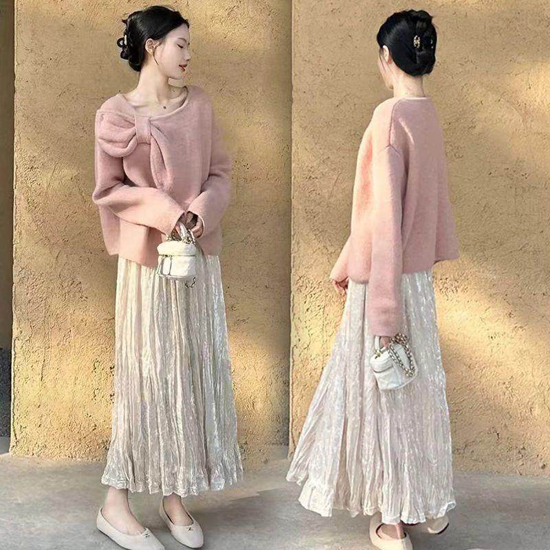 200斤 小香风粉色蝴蝶结针织毛衣半身裙两件套装 大码 胖mm秋冬法式