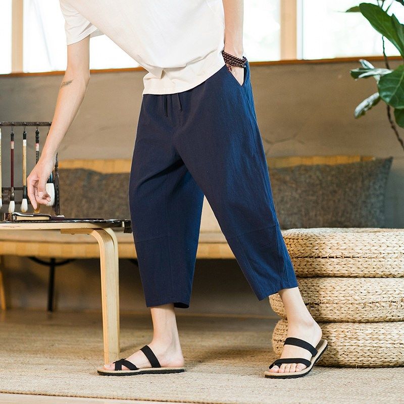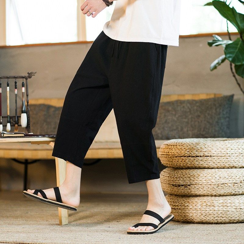 纯棉薄款 夏季 大码 宽松休闲亚麻裤 棉麻八分裤 潮流胖子七分裤 男士