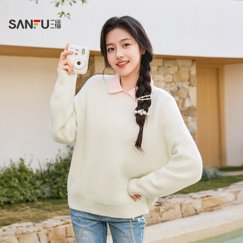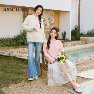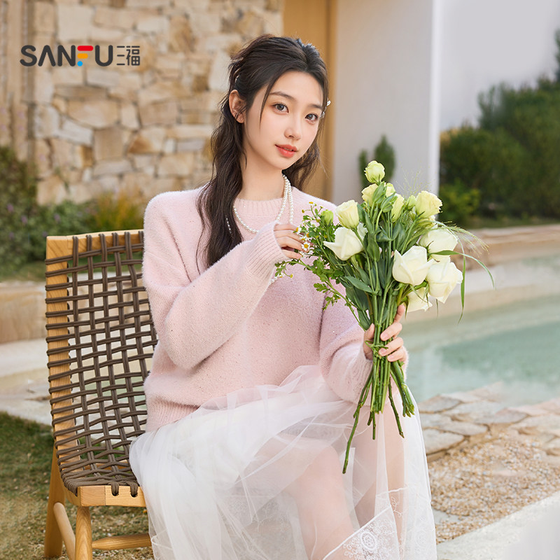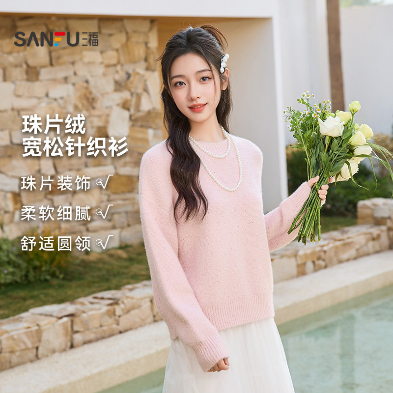 514650 休闲珠片圆领宽松套头上衣女装 三福粉色毛衣女2026新款 春季