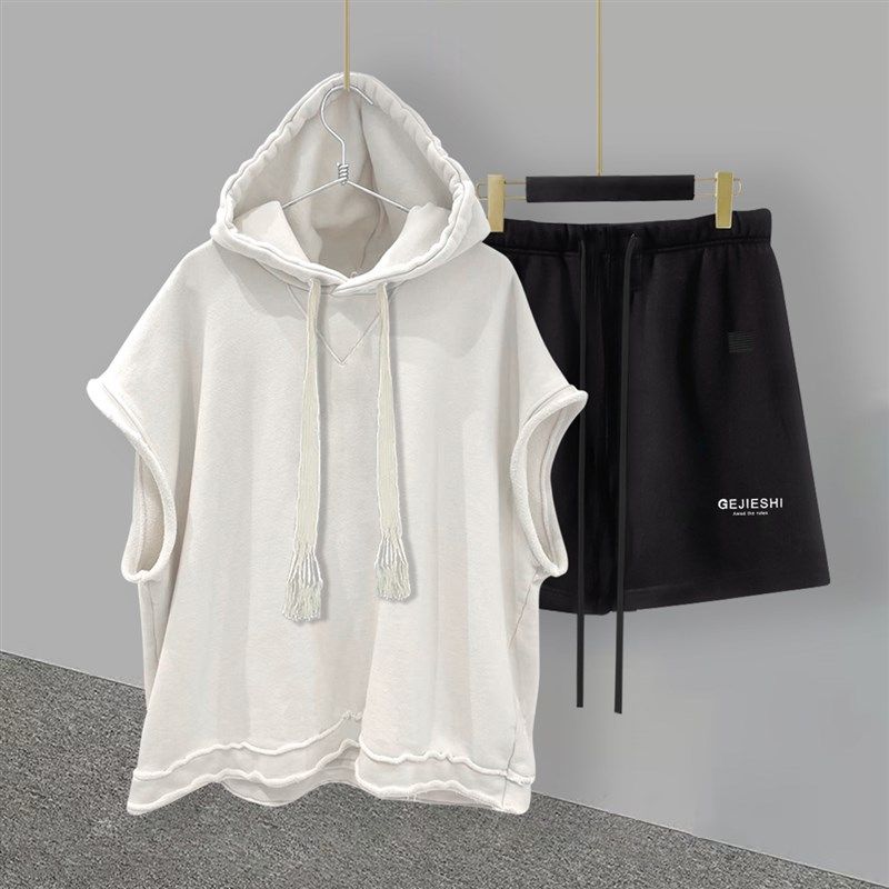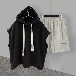 潮流拼接帅气学生宽松直筒五分裤 纯色连帽无袖 韩版 男夏季 t恤套装