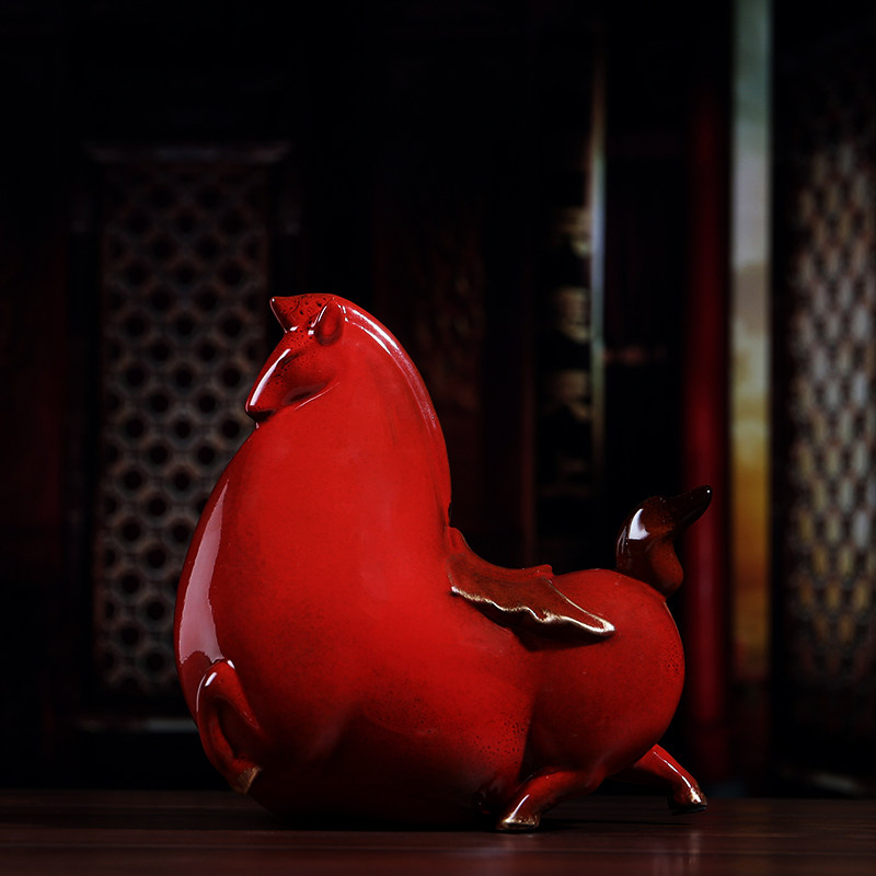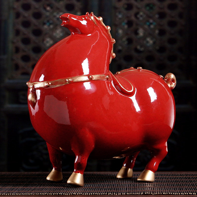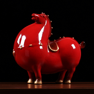 招财红色唐马摆件陶瓷家居客厅办公桌面酒柜装 饰摆设瓷器马工艺品
