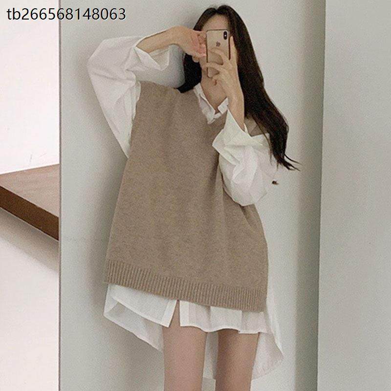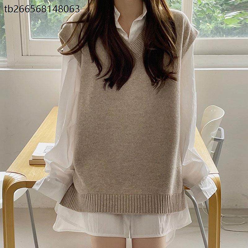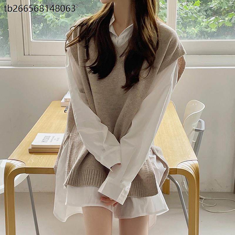 V领针织背心套装 韩国时髦 宽松 简单百搭翻领系带白衬衫 秋季