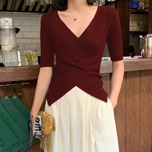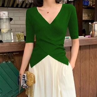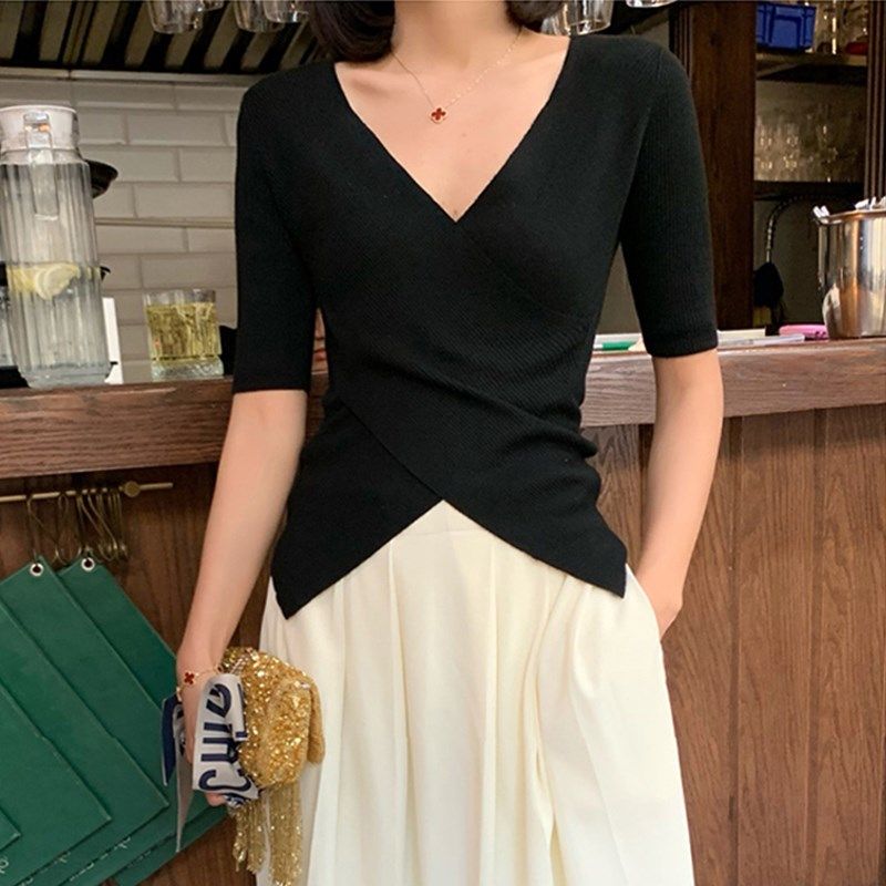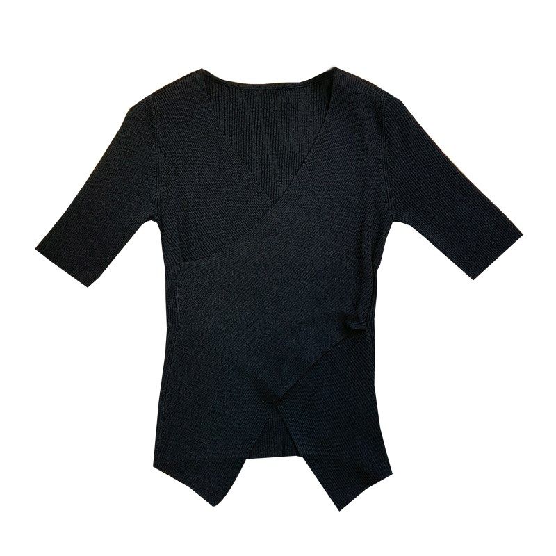 打底衫 2024早秋新品 女内搭洋气五分袖 针织衫 黑色紧身上衣 V领中袖