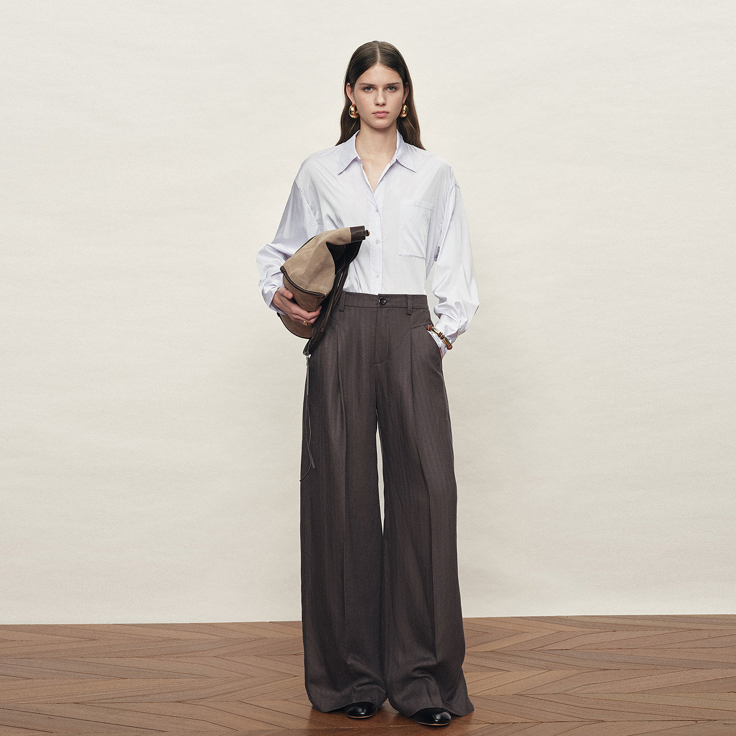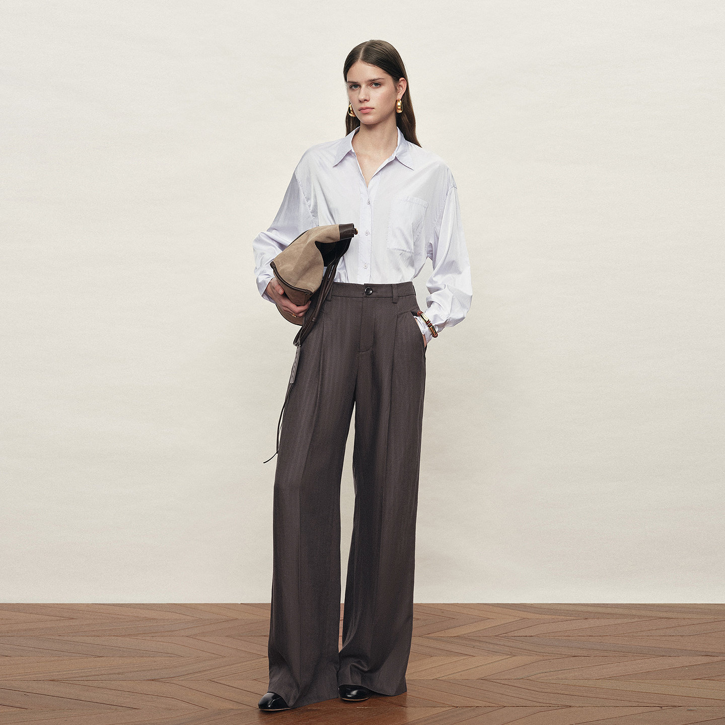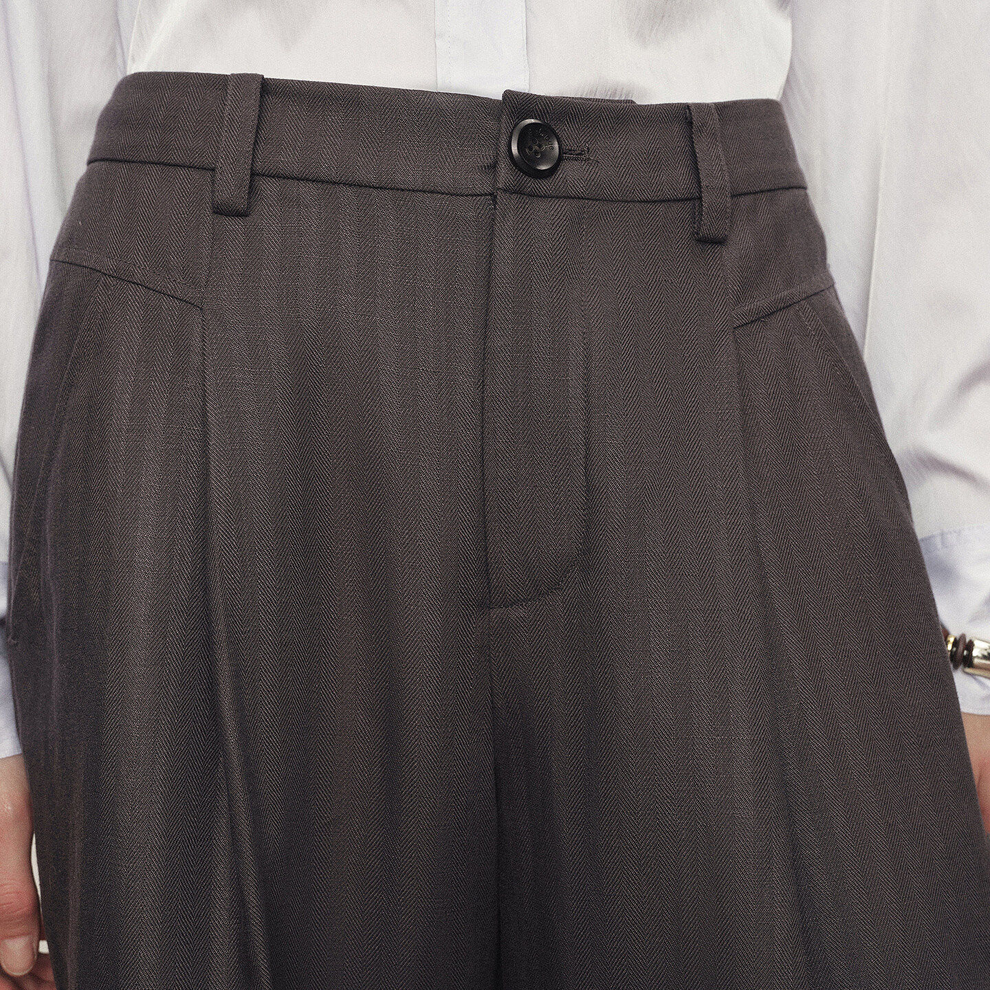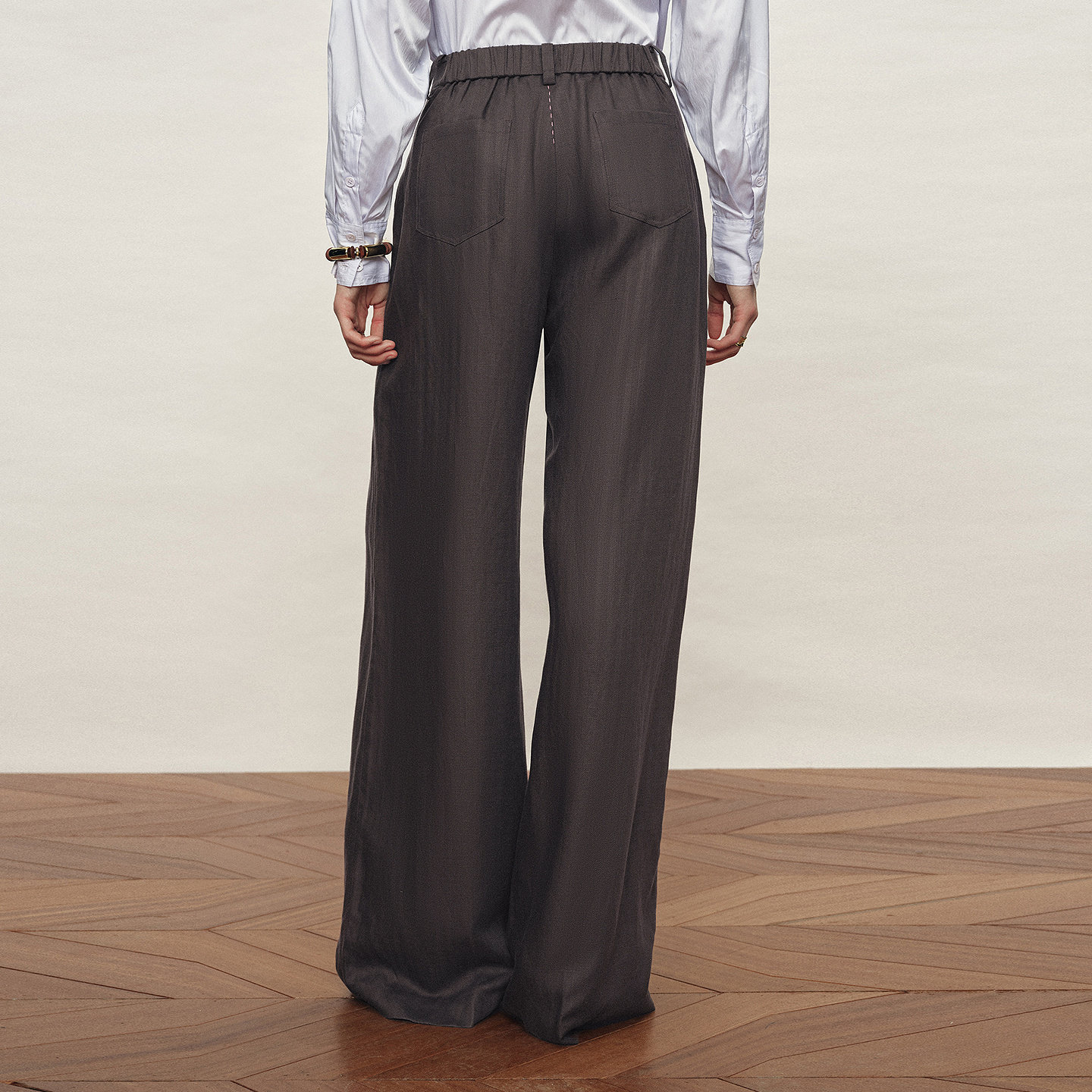 女2026年春新品 Fabrique 雾灰色垂感天丝亚麻半松紧腰阔腿休闲裤