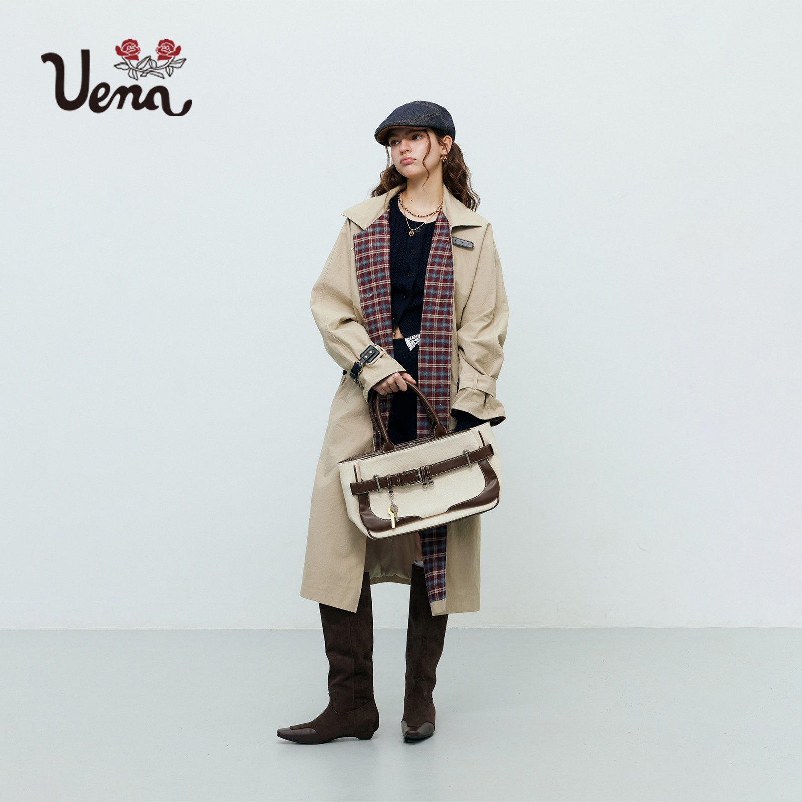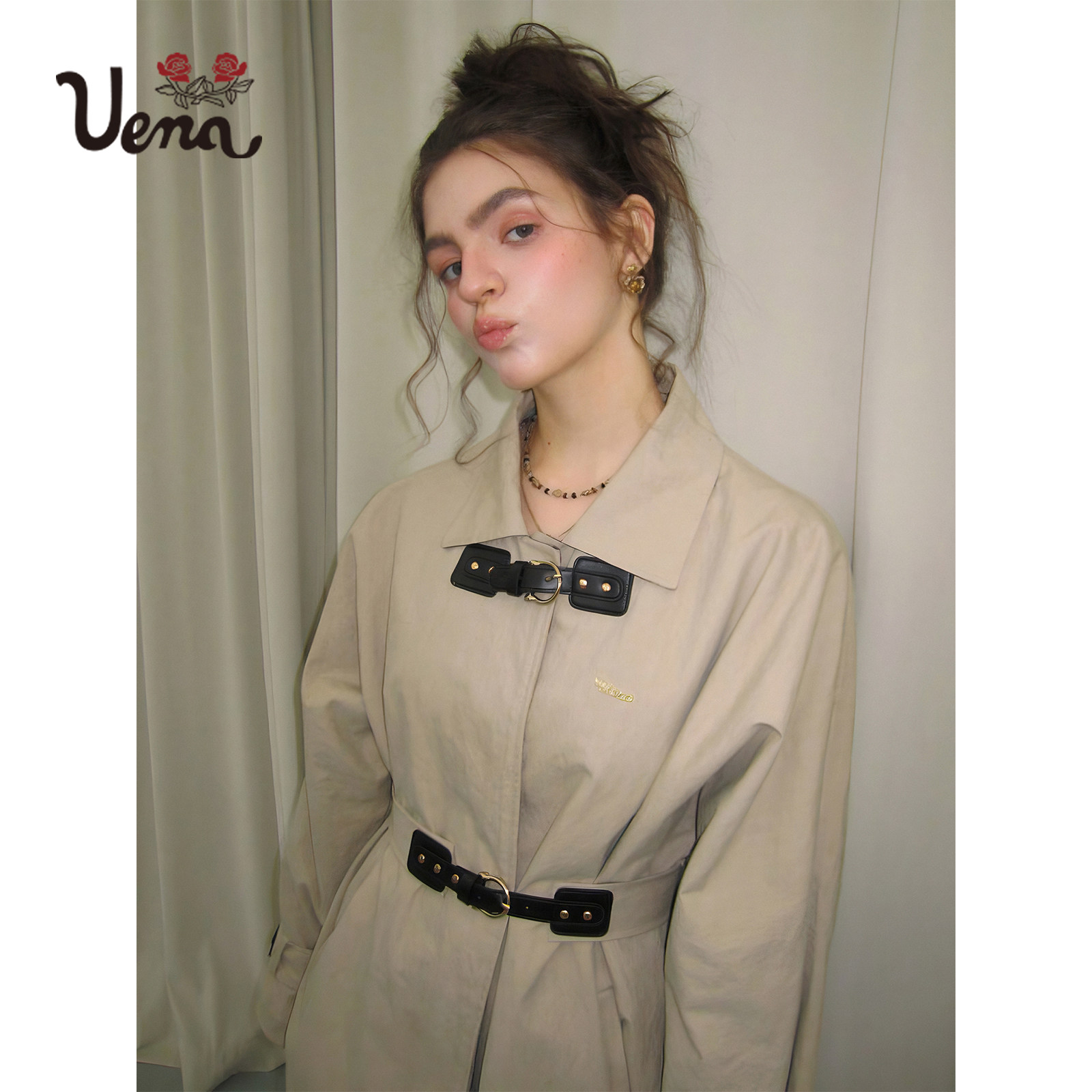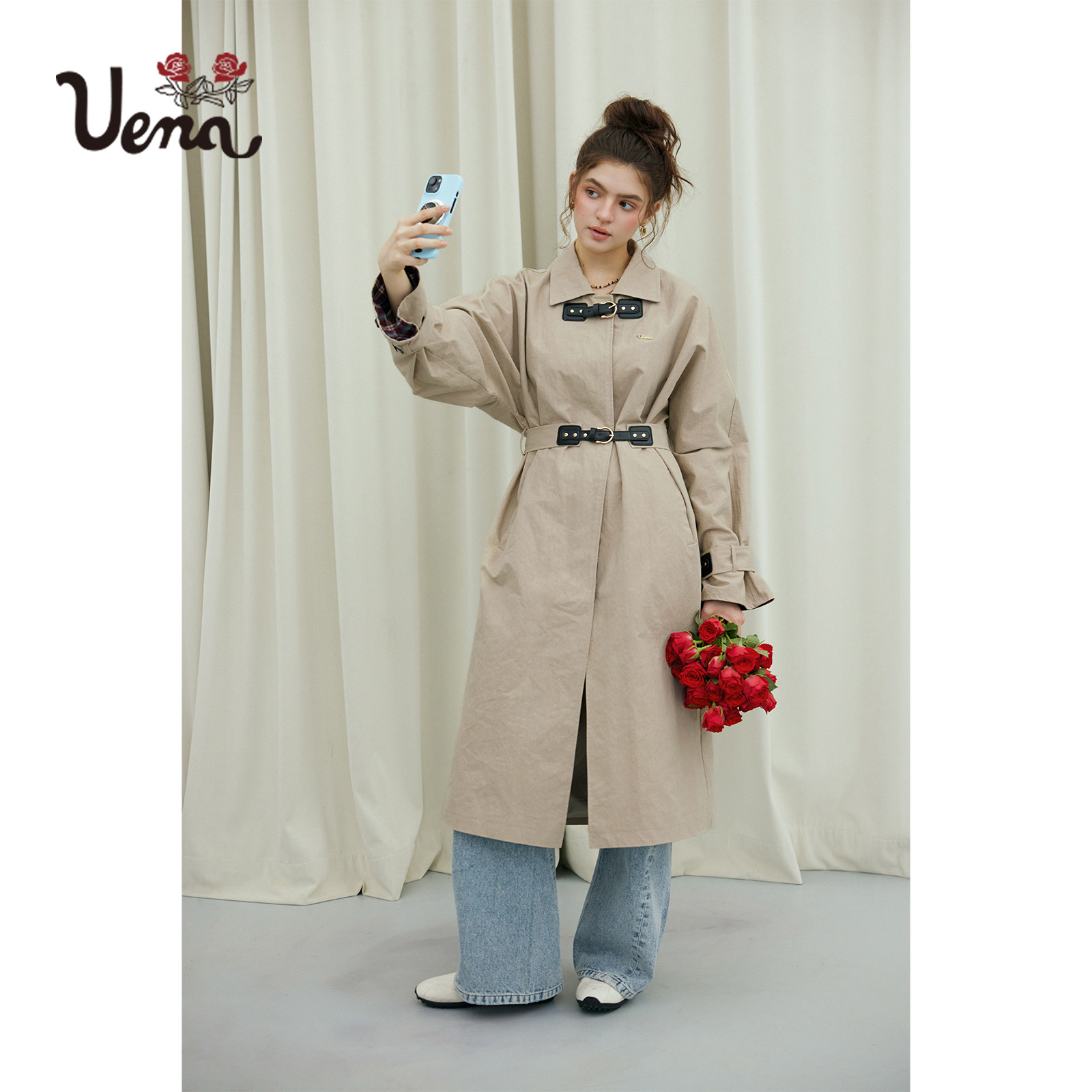 风衣女附皮袢腰带 Uena卡其色翻领宽松格纹暗门襟长款 海雾船笛