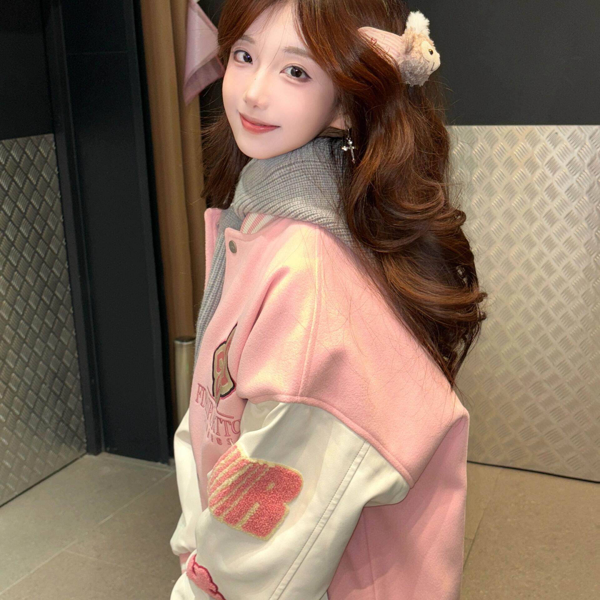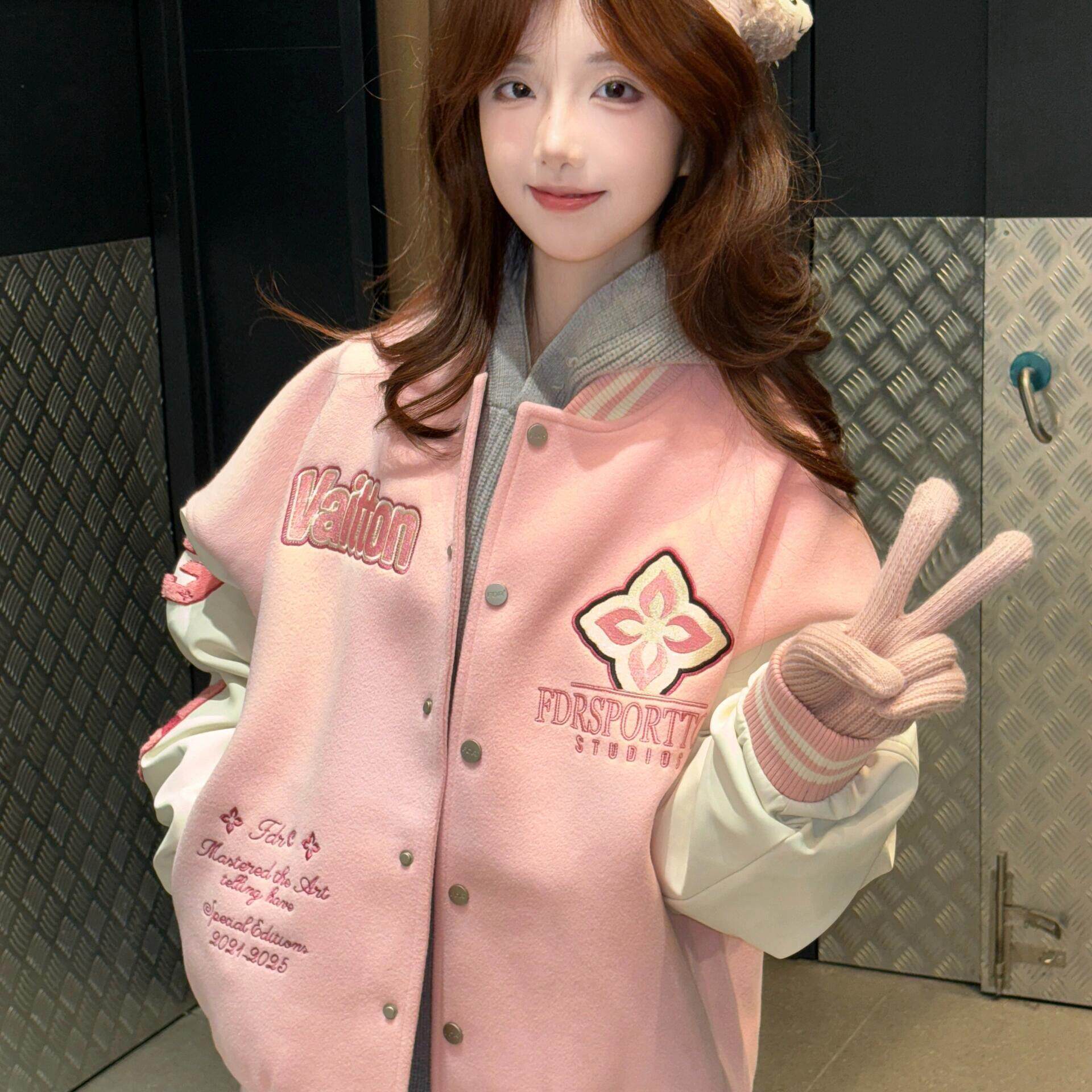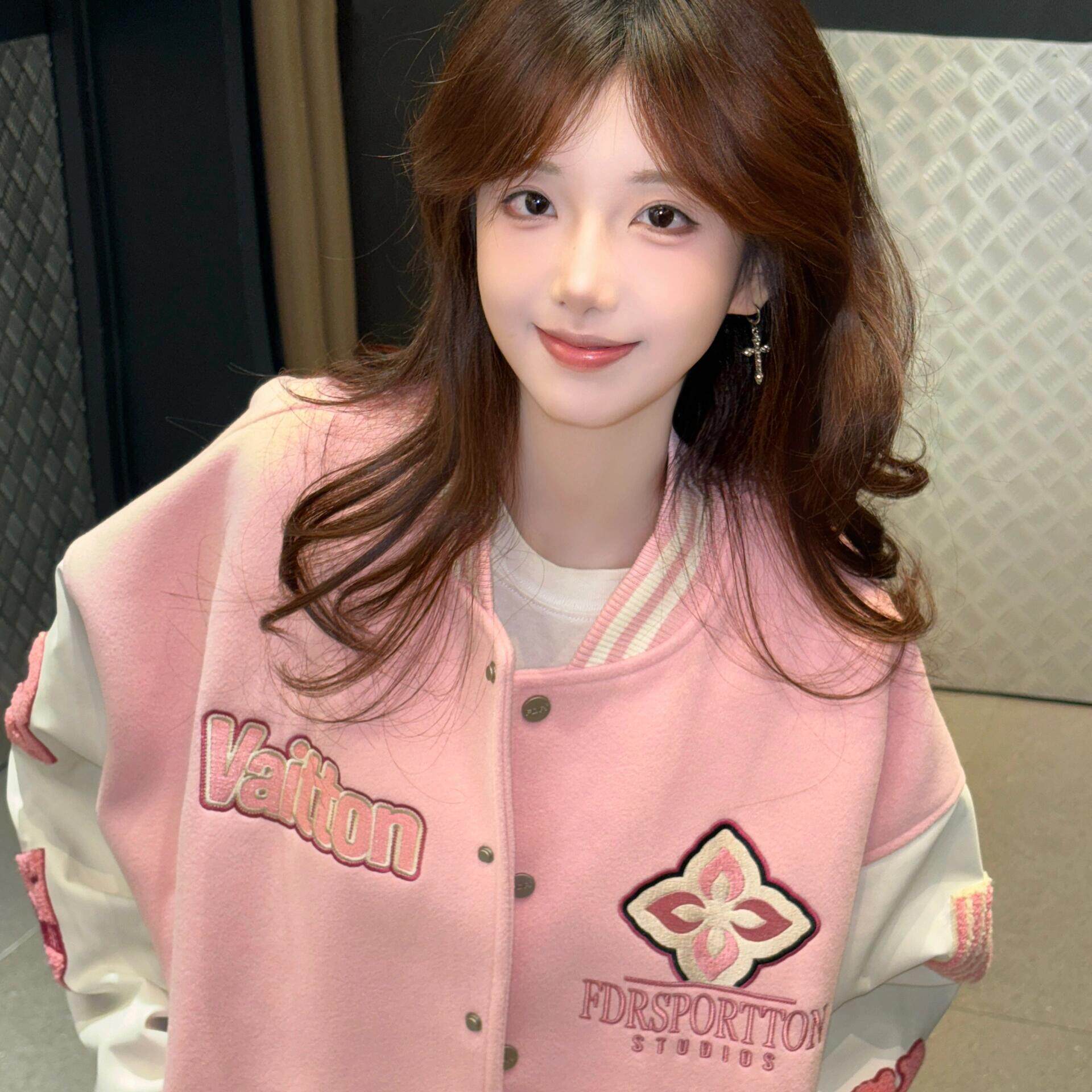 美式 撞色巨好看宽松外套夹克上衣潮 粉色毛巾绣棒球服2025秋冬新款