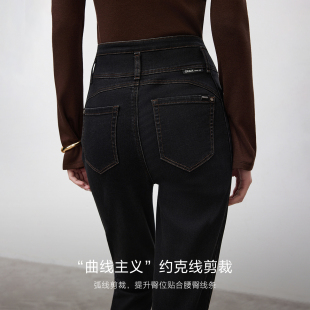 子 高腰显瘦弹力拖地裤 拉夏贝尔黑色加绒微喇牛仔裤 女2025秋冬新款