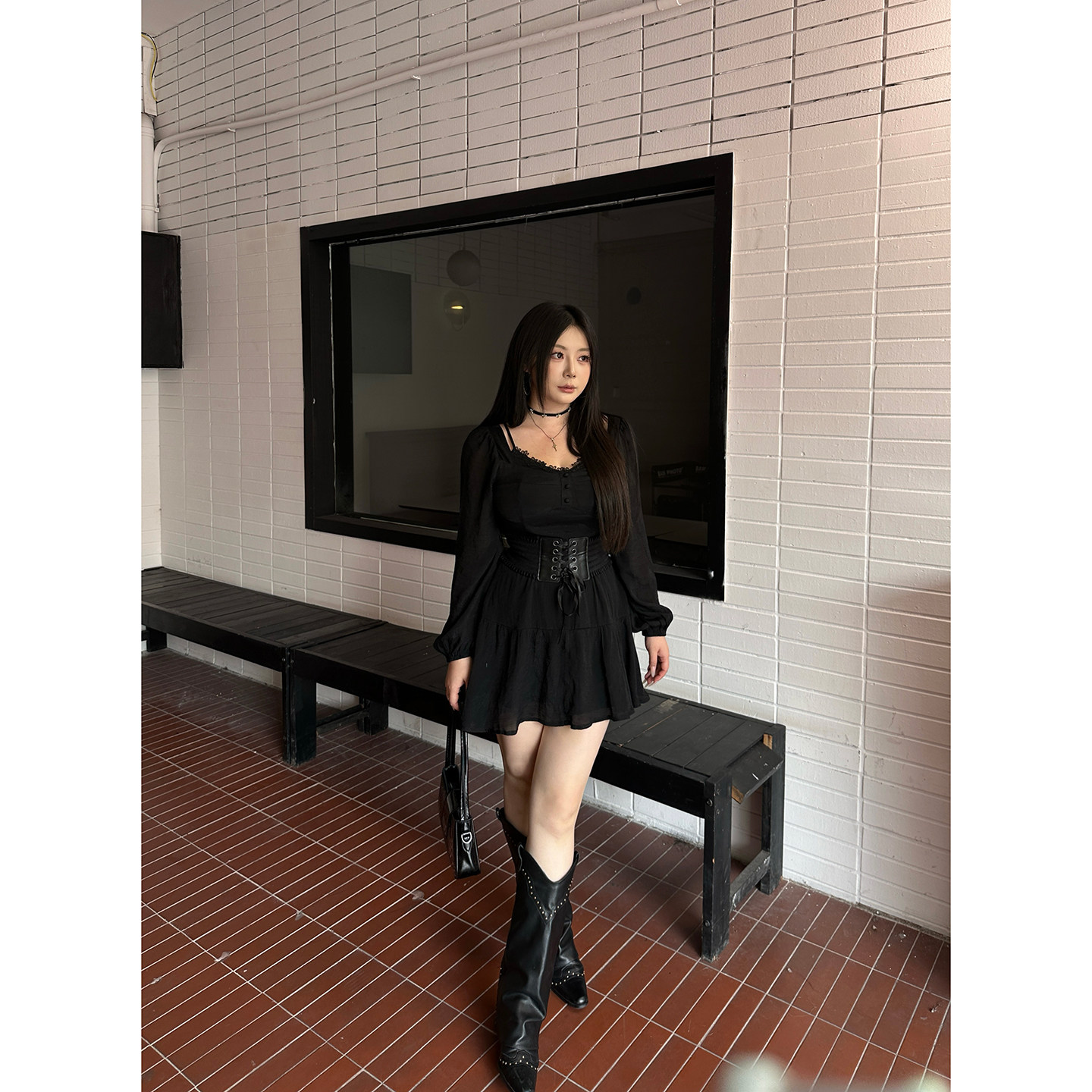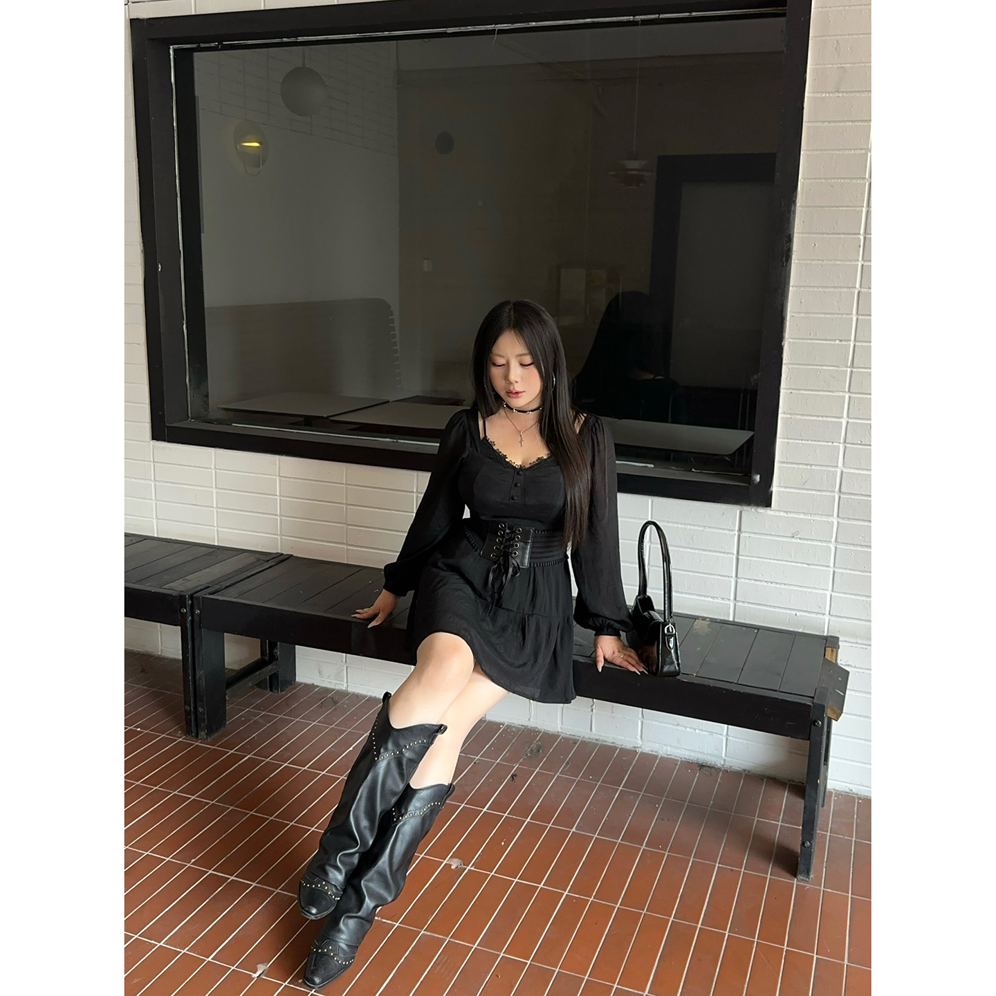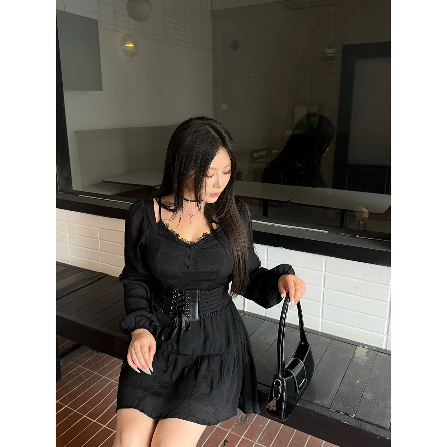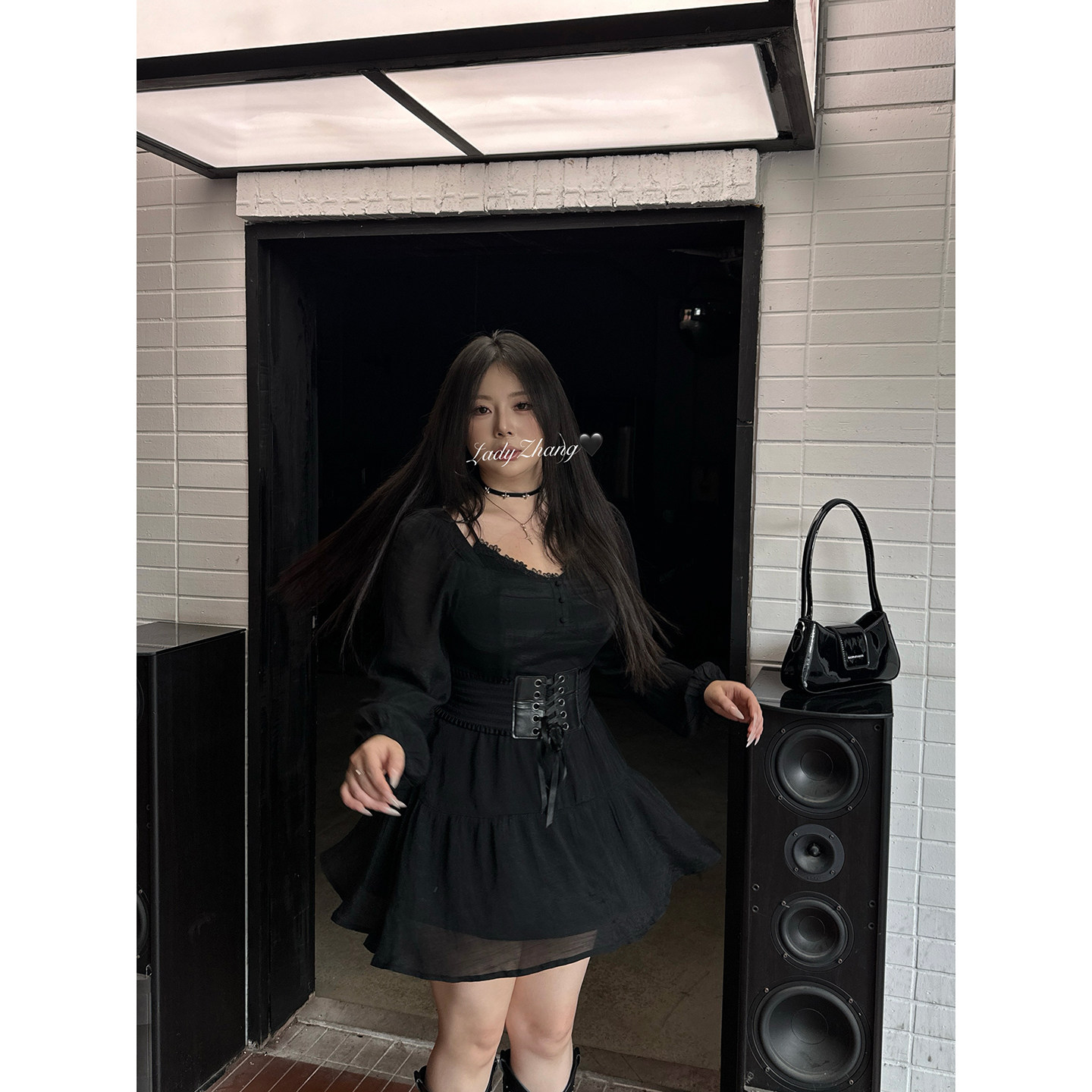 甜酷长袖 法式 收腰连衣裙女气质小黑裙 暗夜序曲 大小姐微胖大码
