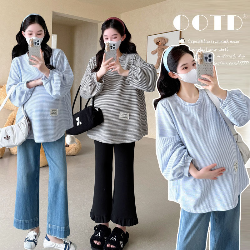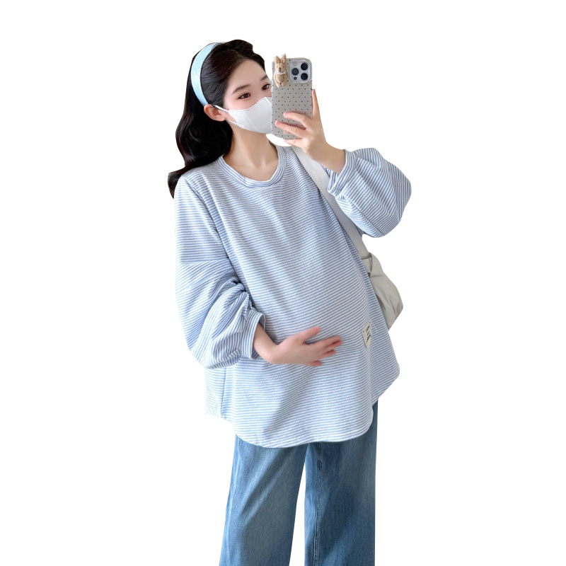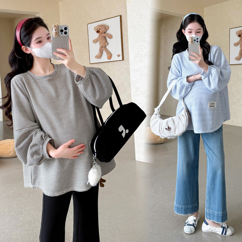 条纹T恤上衣女宽松显瘦长袖 大码 时尚 韩版 卫衣200斤潮 孕妇春秋新款
