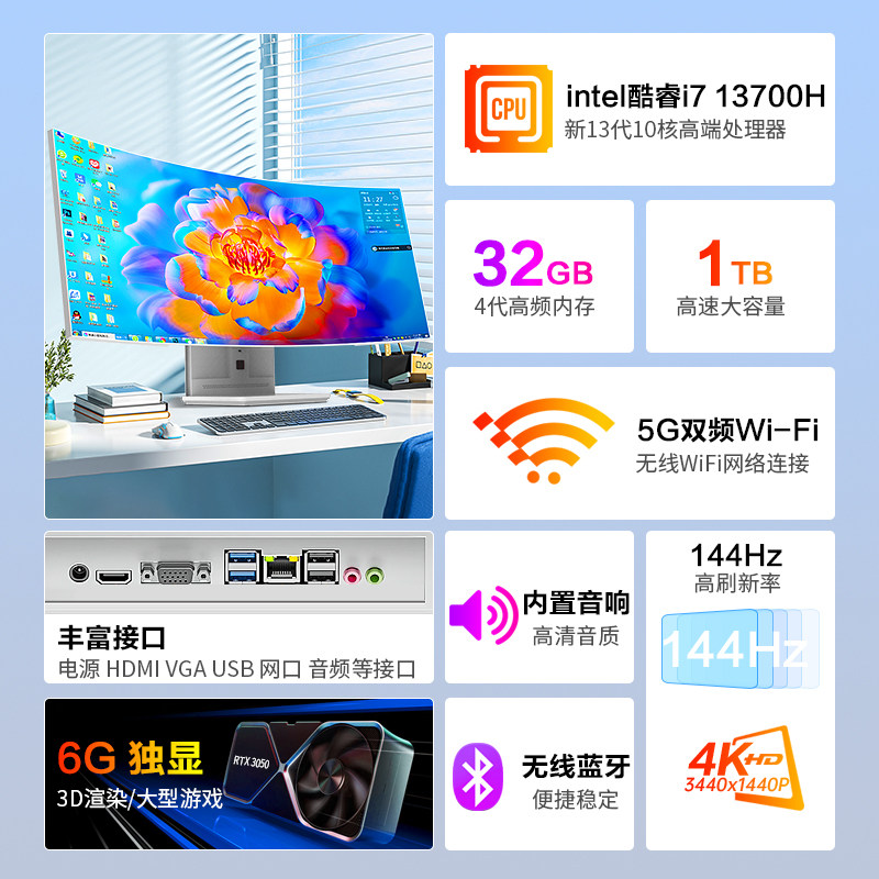 玮普纳34英寸4K曲面带鱼屏超薄台式 一体机电脑酷睿i3i5i7高配炒股家用办公商用设计直播电竞游戏全套整机