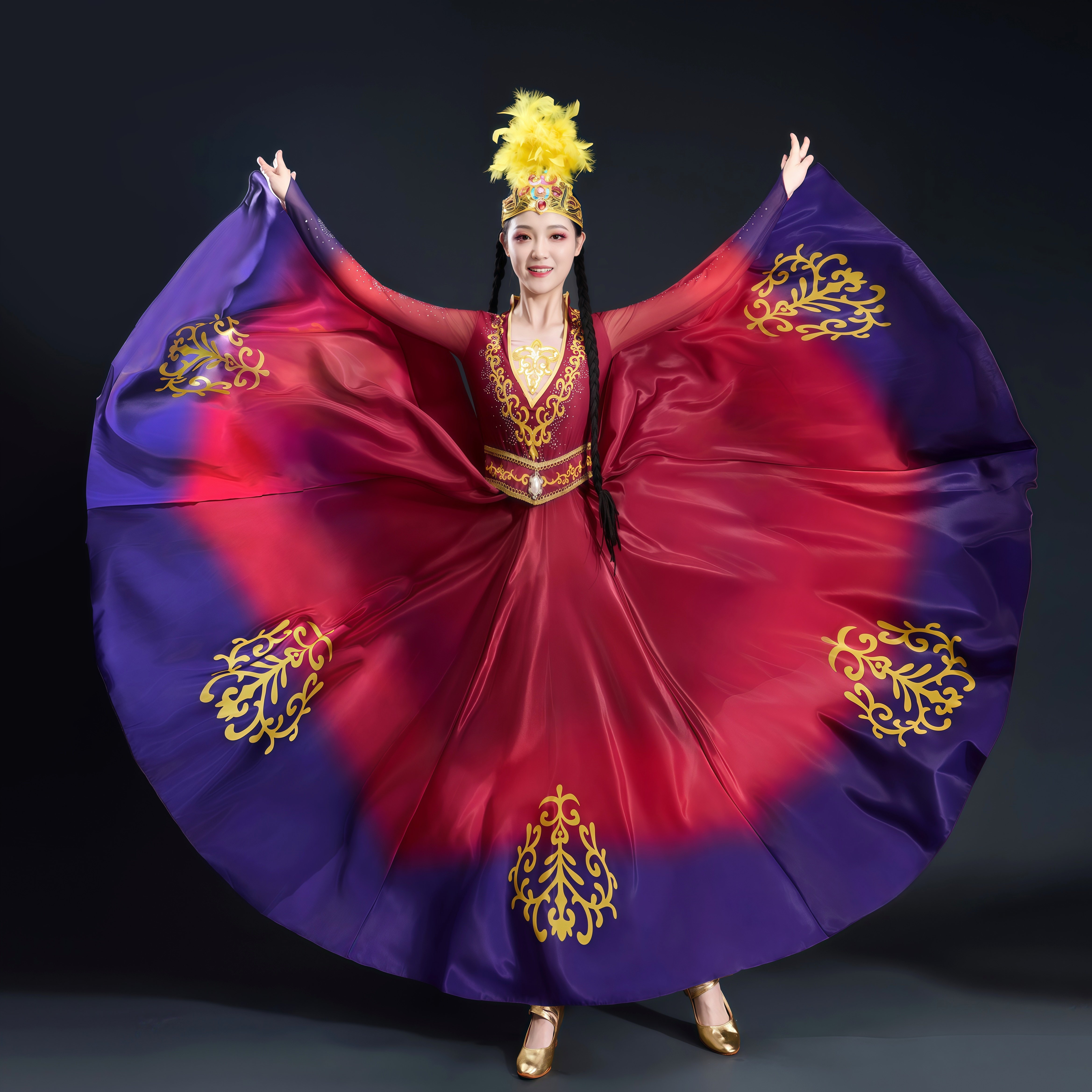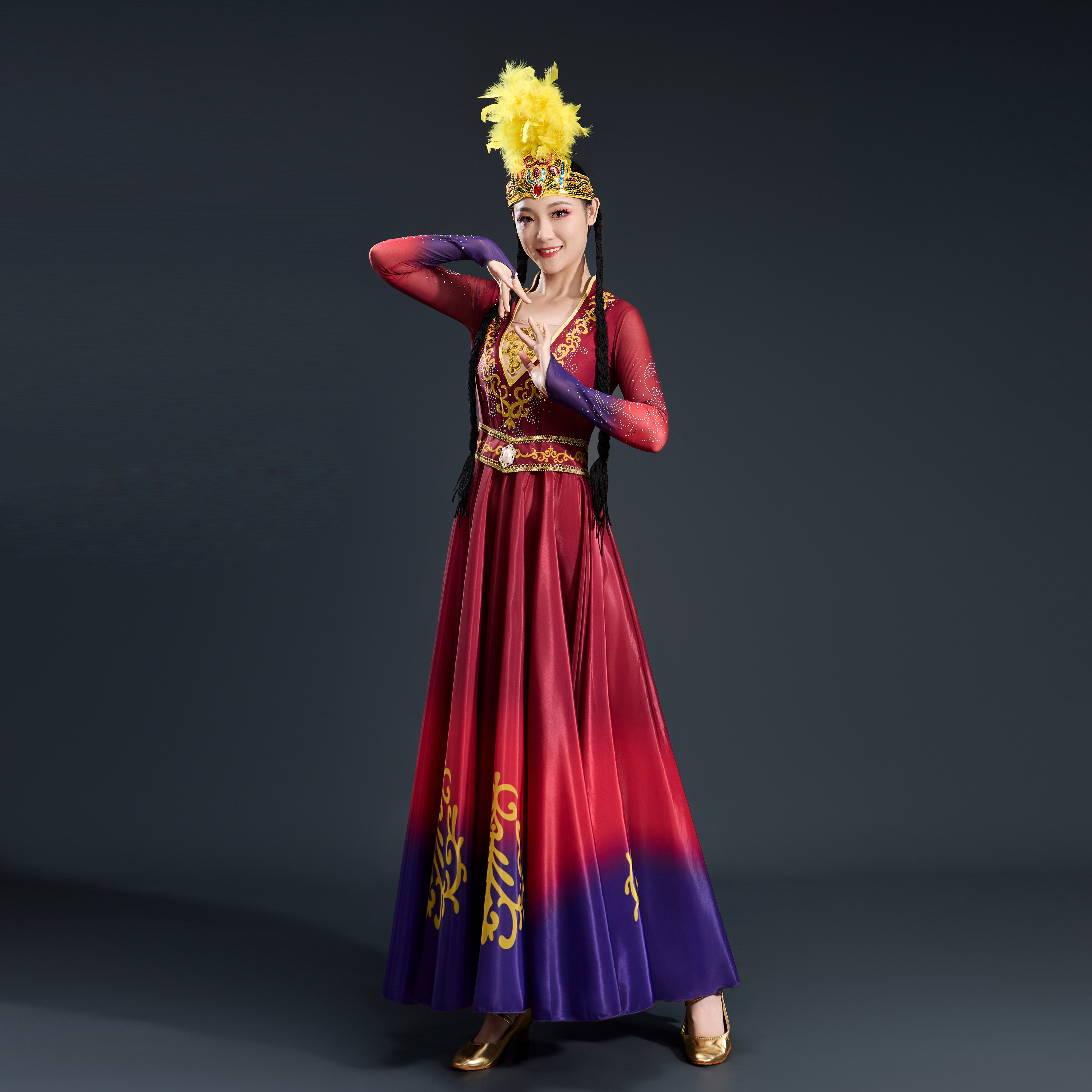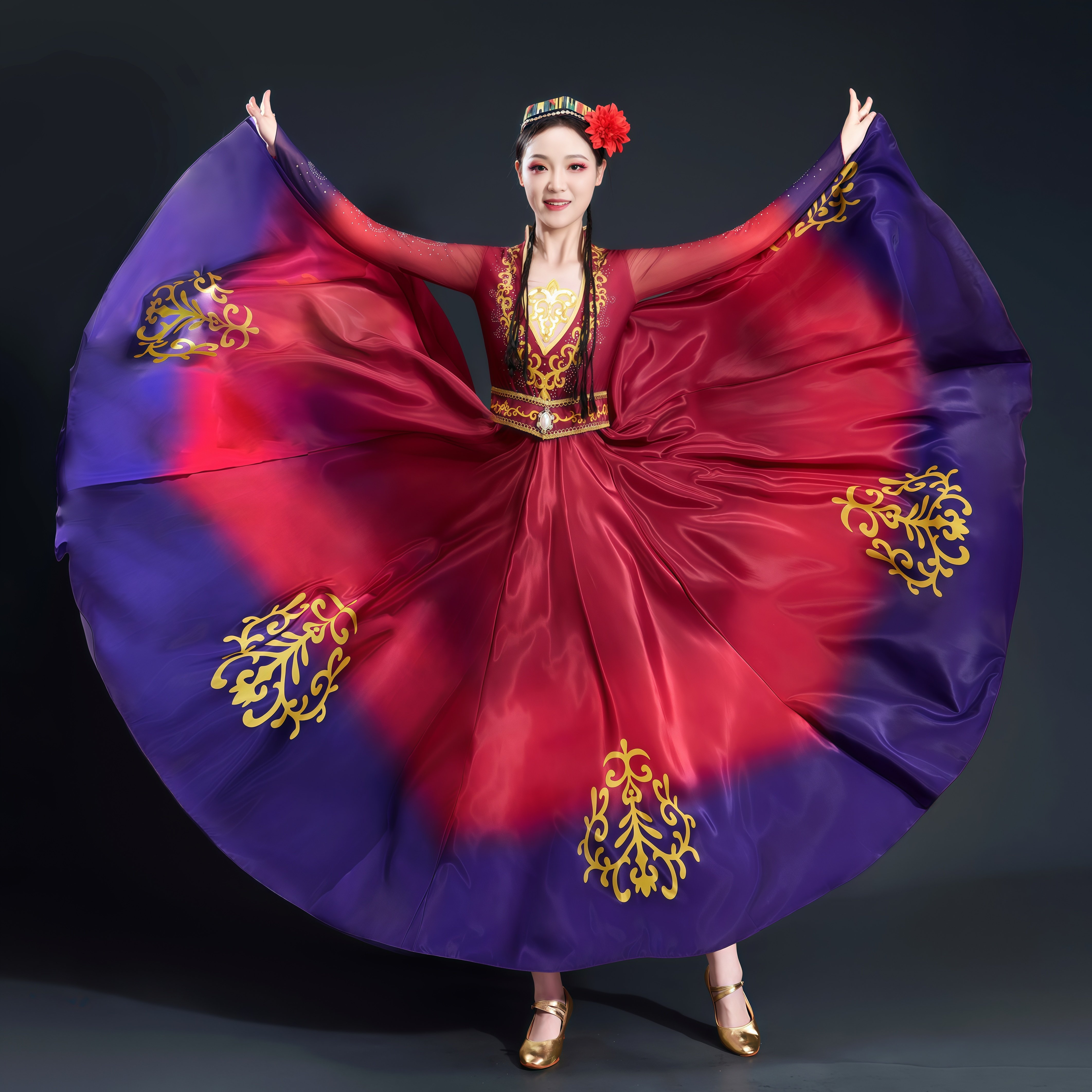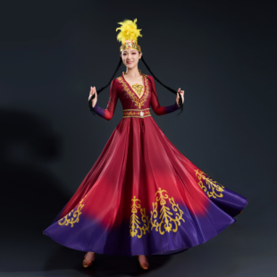 新疆维族舞蹈服装 女表演大摆裙艺考剧目练习服渐变大摆裙演出服
