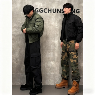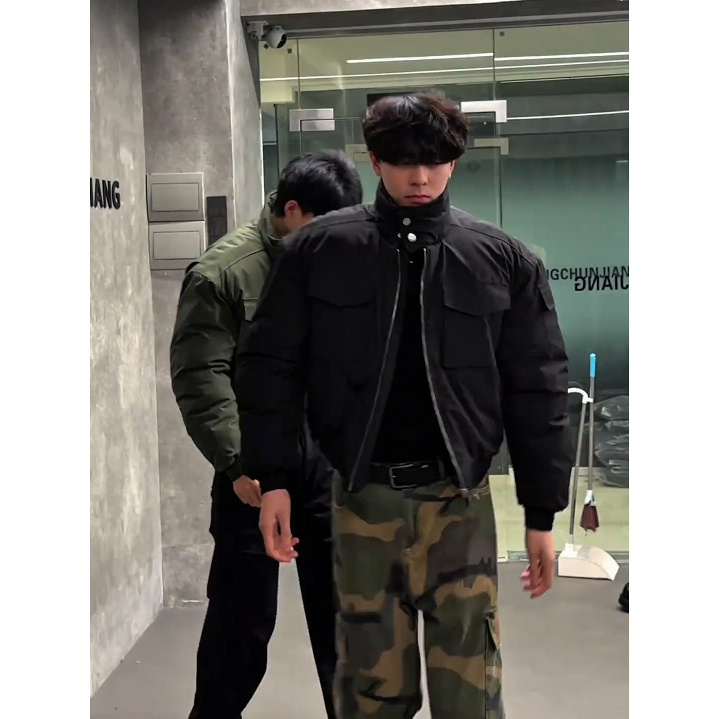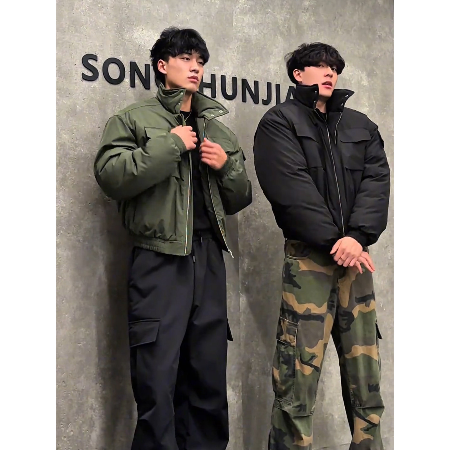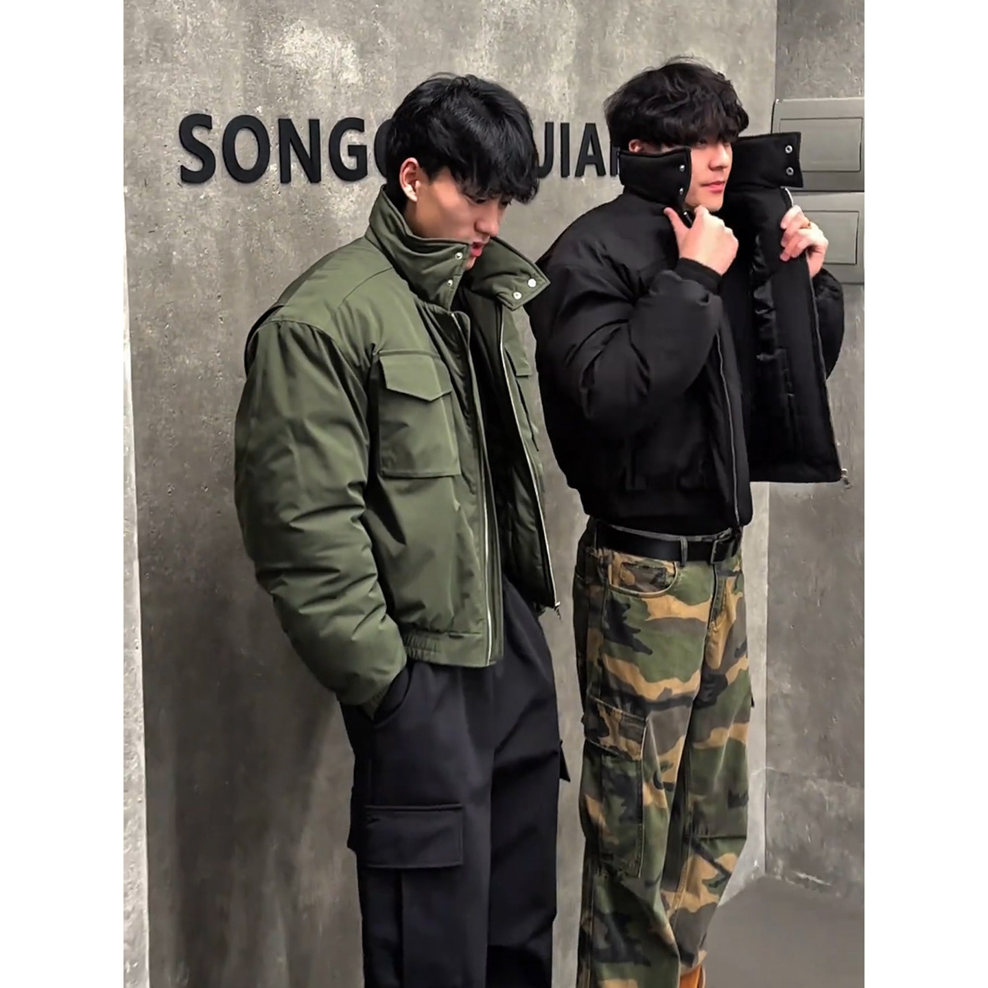 棉衣廓形正肩立领夹克 bomber工装 军绿色轻骑兵棉服冬季 男痞帅短款