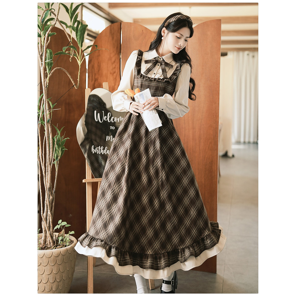 苏浅慕颜复古格纹英伦学院假两件连衣裙女秋冬森系气质打底中长裙