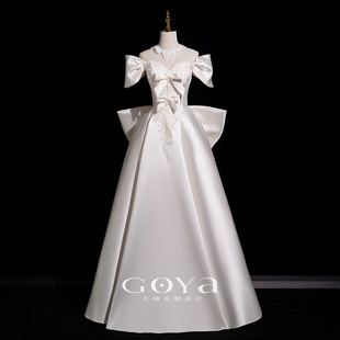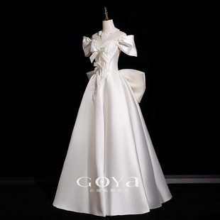 白色一字肩轻婚纱缎面高级感新娘迎宾订婚礼服法式 简约出门纱齐低