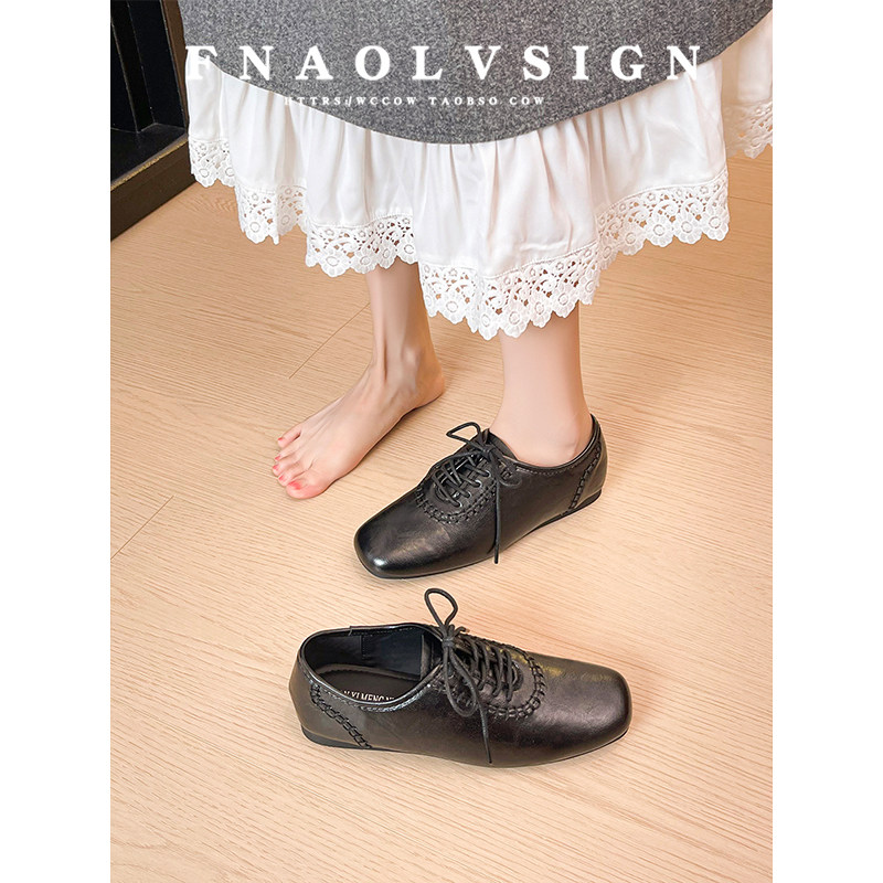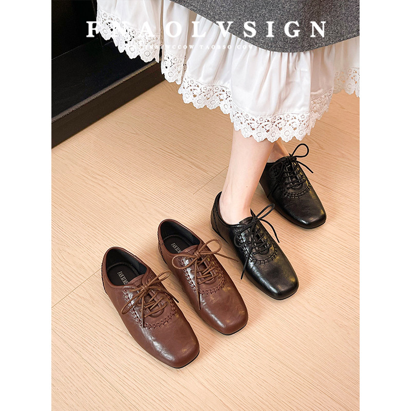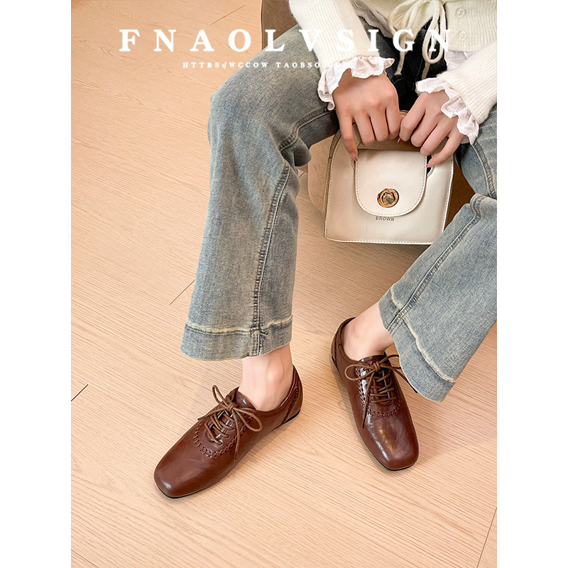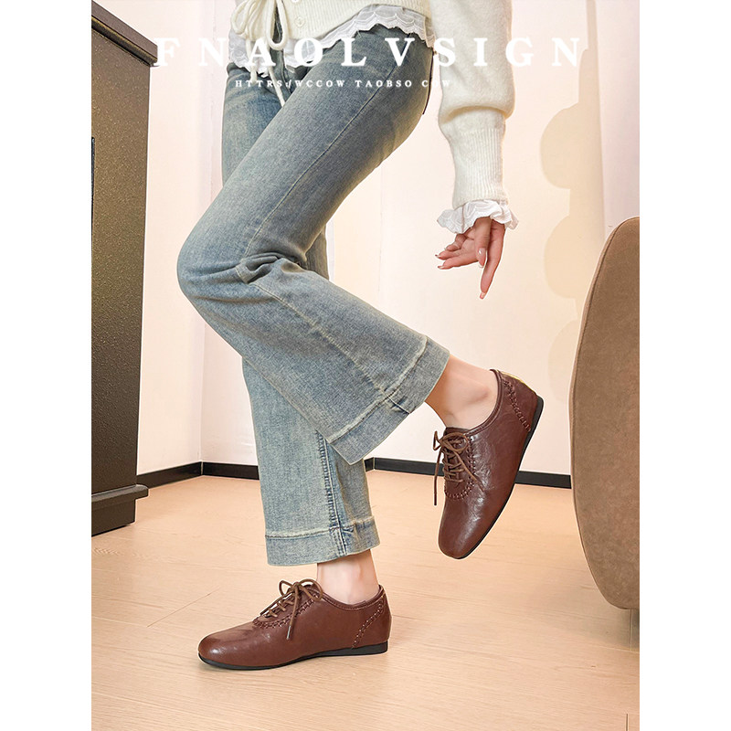 百搭单鞋 牛皮版 女平底小皮鞋 女系带软皮德训鞋 英伦风加绒乐福鞋