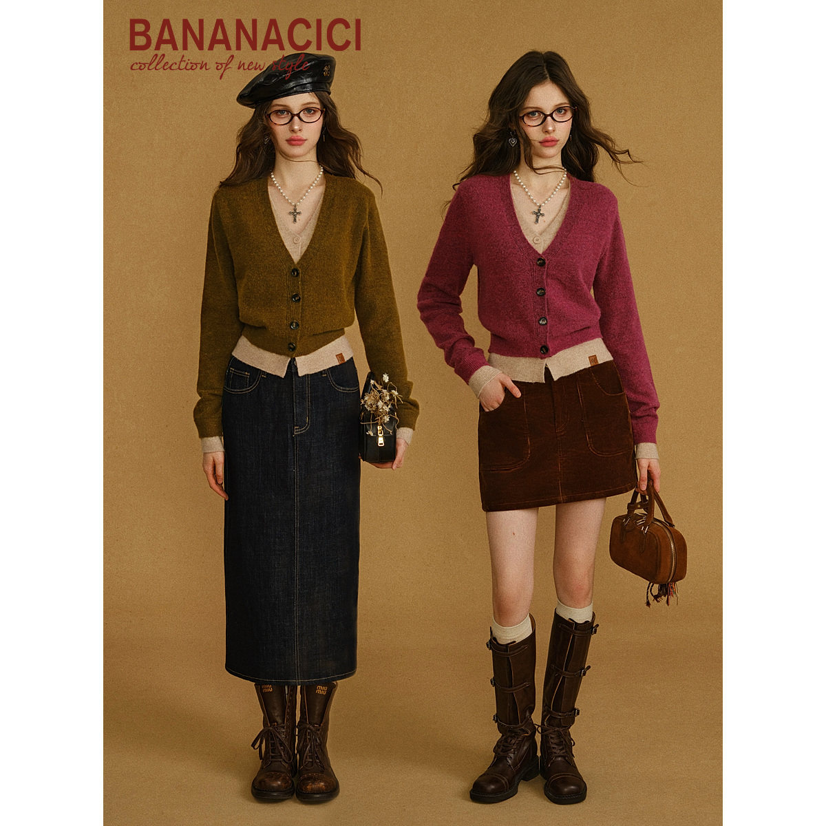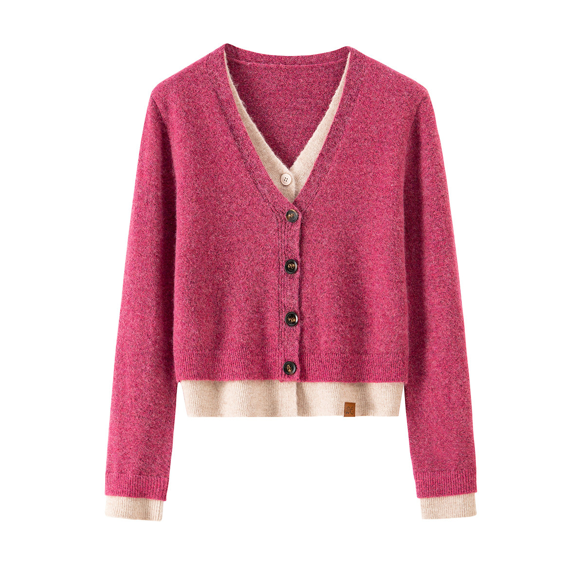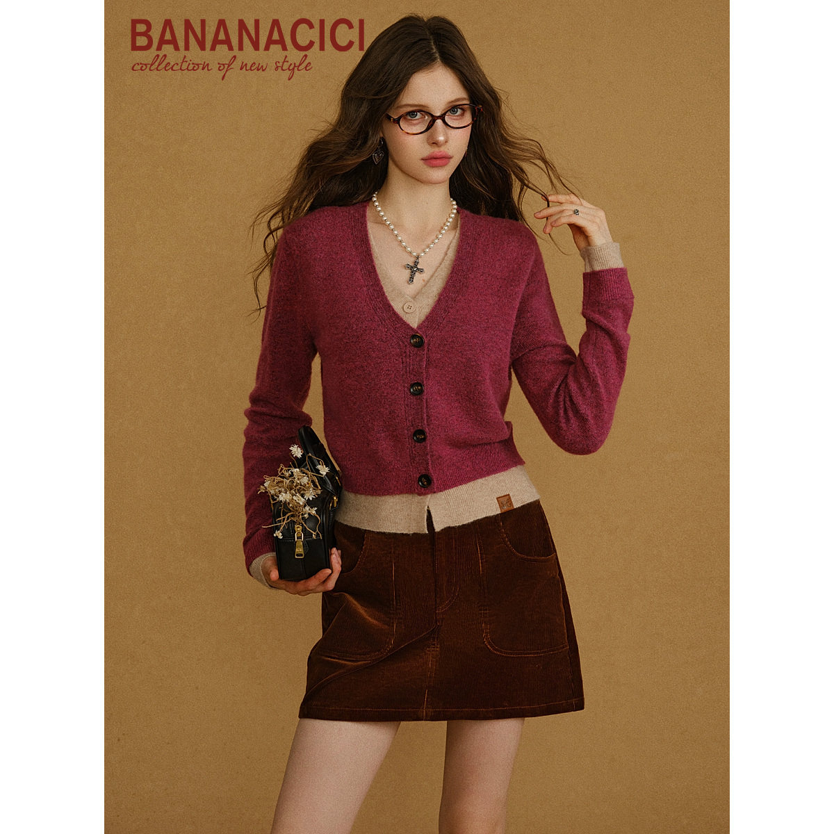 桑蚕丝羊毛混纺假两件撞色毛针织开衫 新款 CICI2025年冬季 BANANA