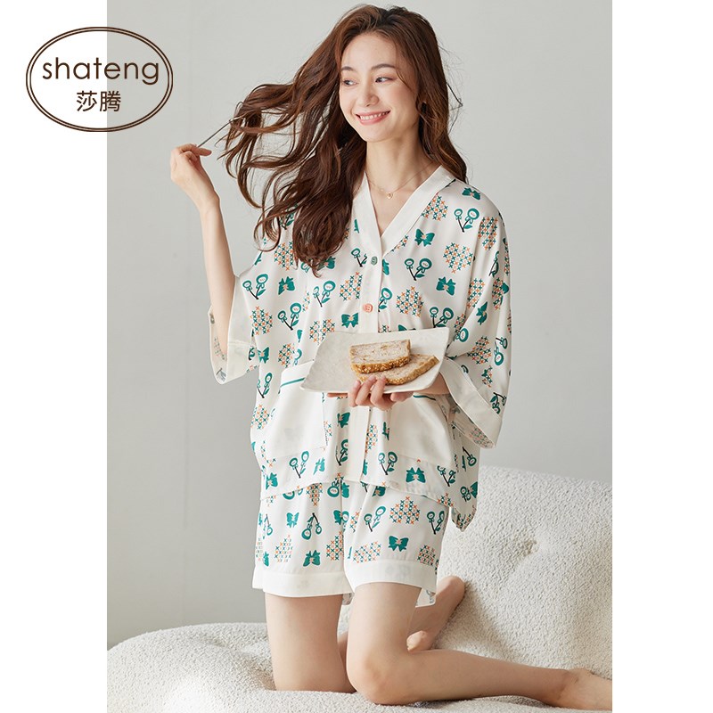 短裤 开衫 大码 冰丝绸睡衣女夏季 可外穿家居服两件套装 短袖 中袖 薄款