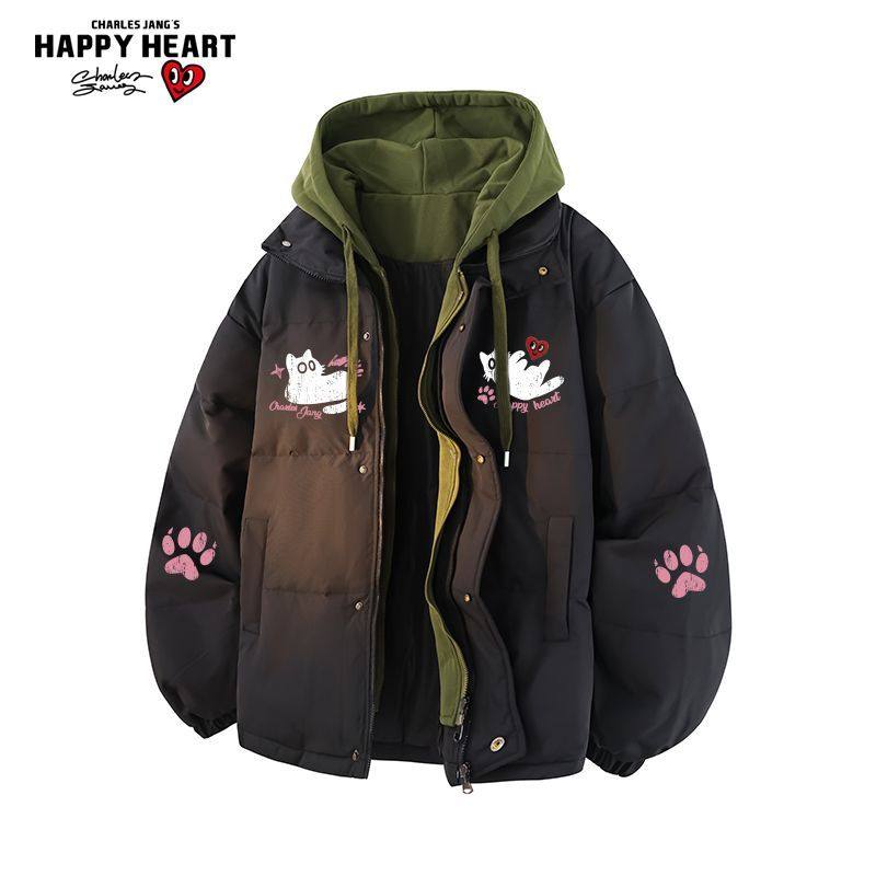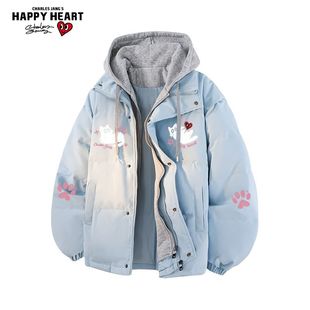 查尔斯桃心小猫印花连帽羽绒服男女冬季 宽松加厚休闲假两件外套潮