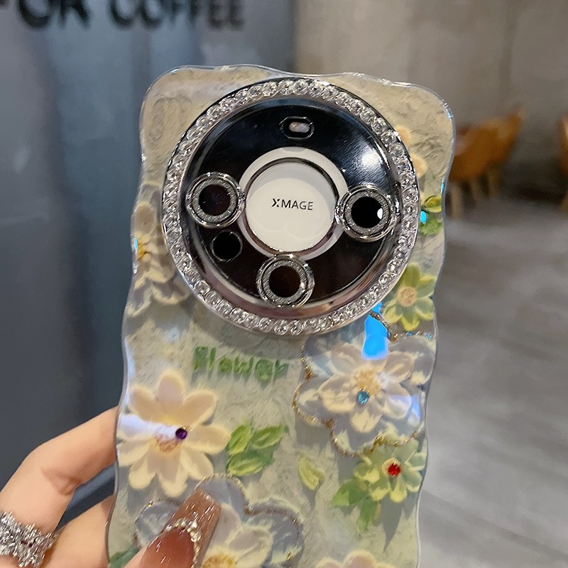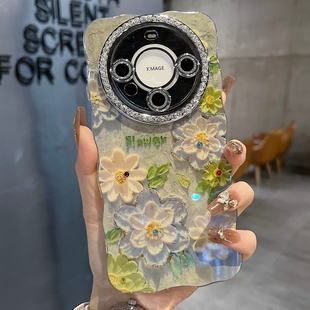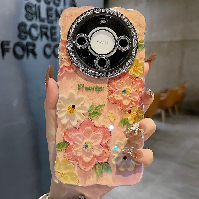 适用华为mate70系列苹果新款 手机壳Pura80小众风flower粉底粉白油画花mate60全包满钻精孔镜框扭边网红保护套