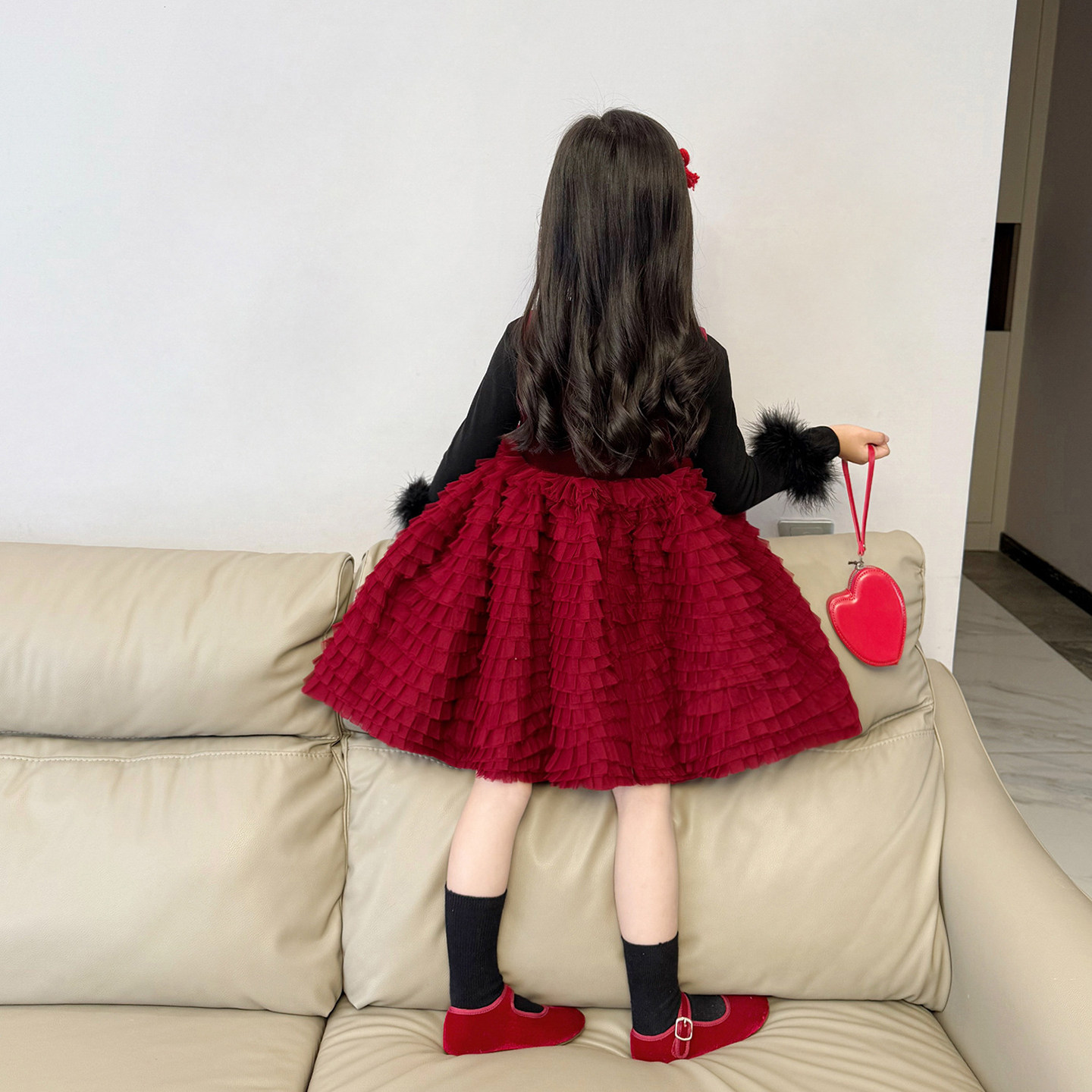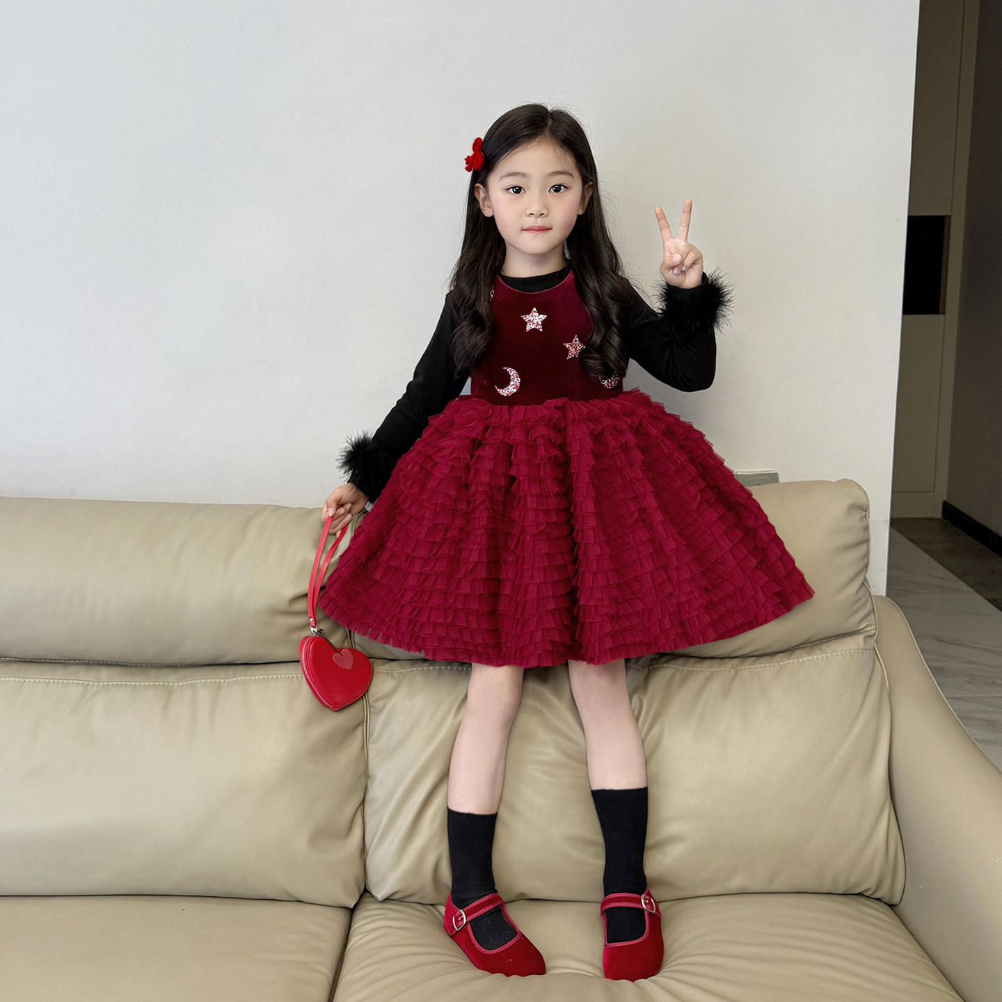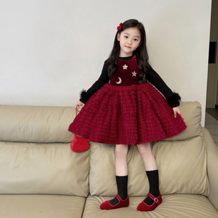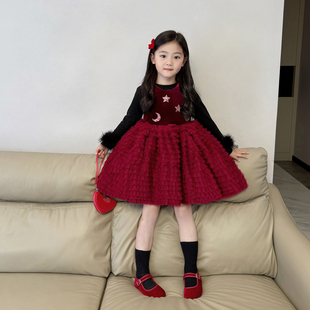 女童红色丝绒网纱蛋糕裙公主裙2025秋冬新款 女孩加绒亮片连衣裙子