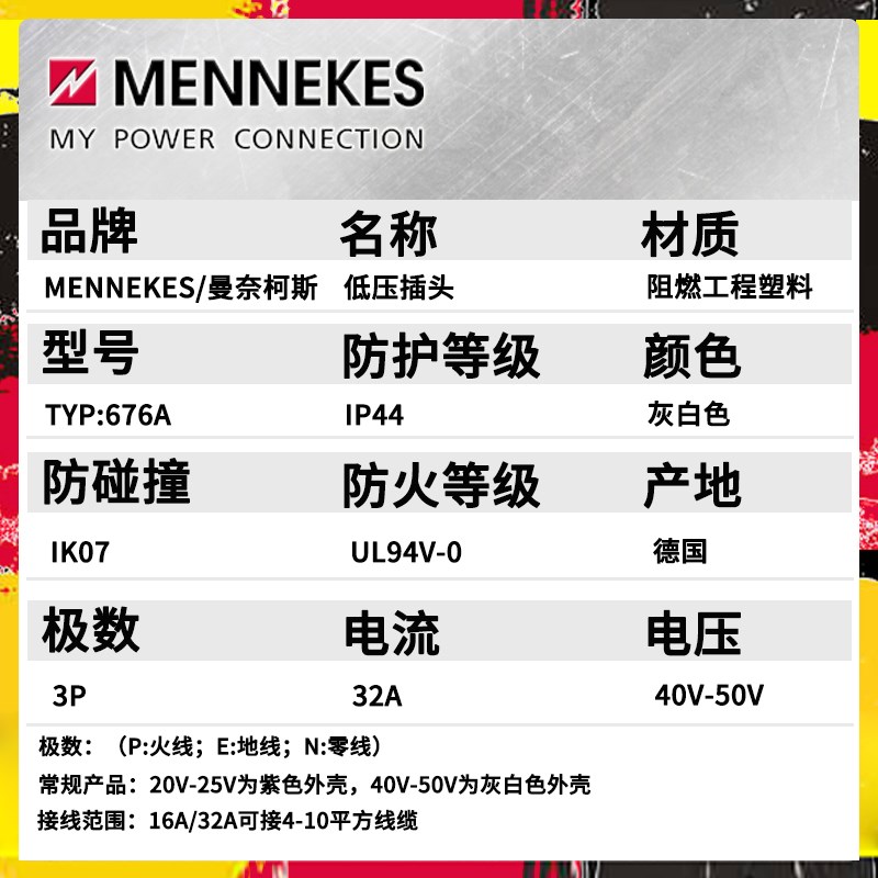 MENNEKES曼奈柯斯32A工业防水插头2芯typ 50V3芯676A 669A低压40V