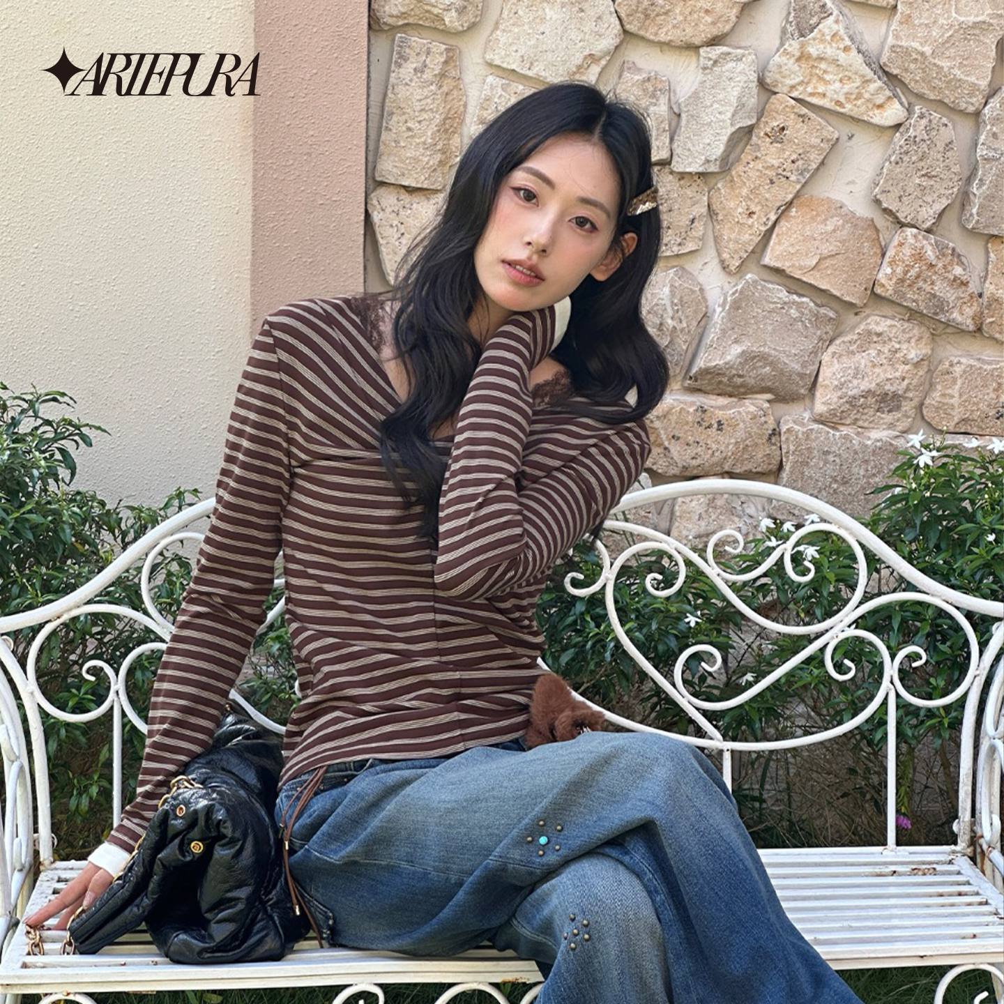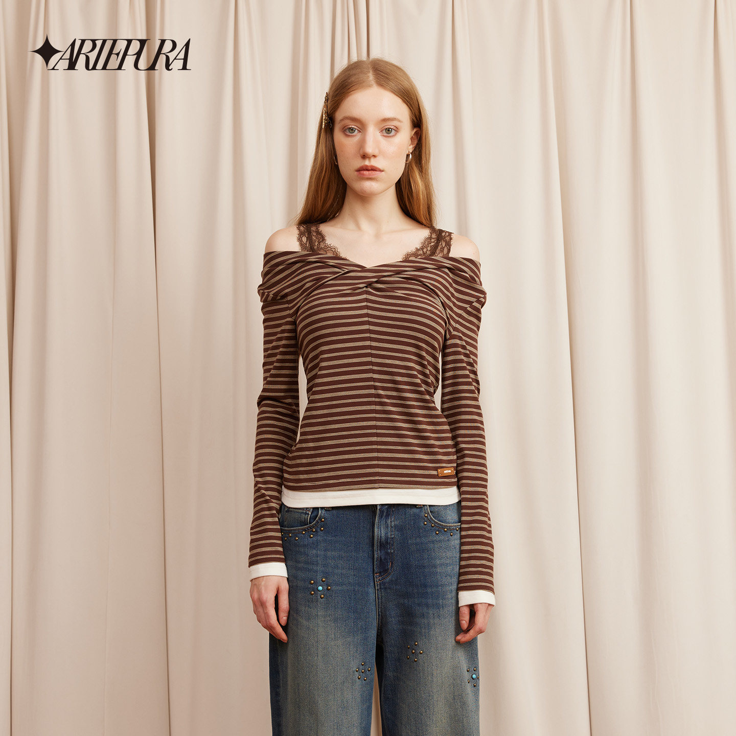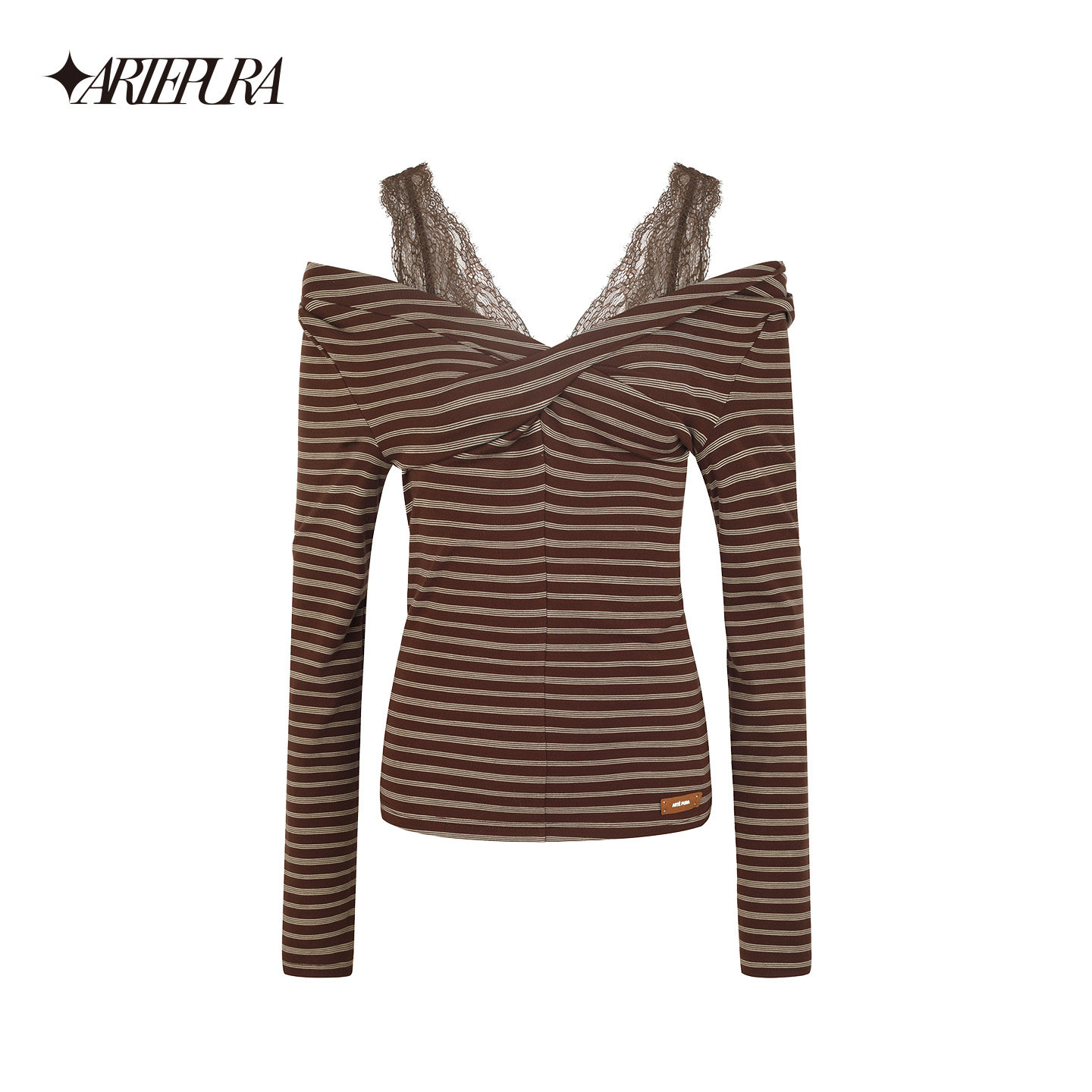 女内搭长袖 棕色条纹蕾丝拼接假两件打底衫 上衣 PURA胶囊新款 ARTE