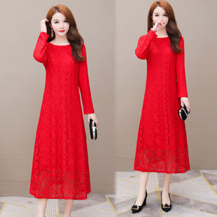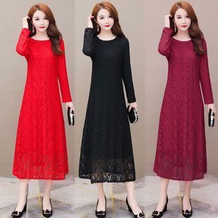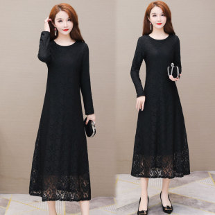 2024春夏季 长款 韩版 遮肚胖mm大码 打底长裙 长袖 黑色蕾丝连衣裙女装