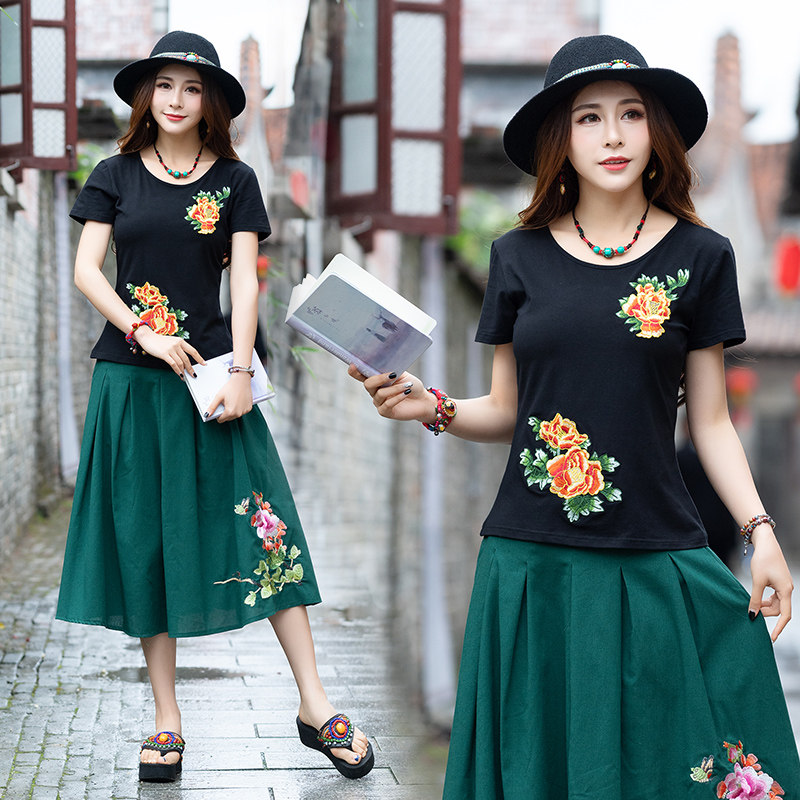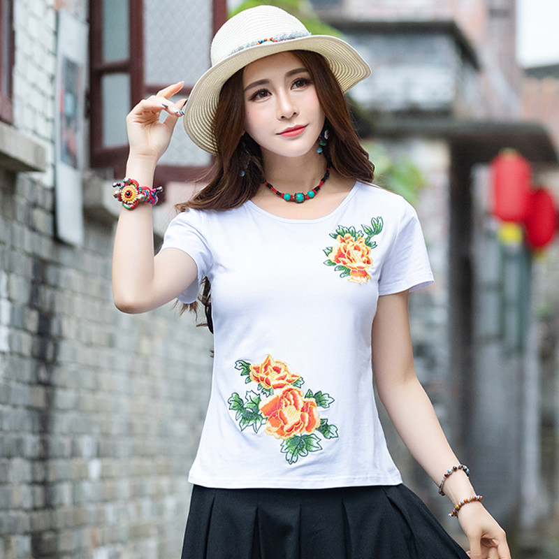 民族风绣花圆领纯棉修身 复古中国风大码 夏装 T恤2020新款 上衣 短袖