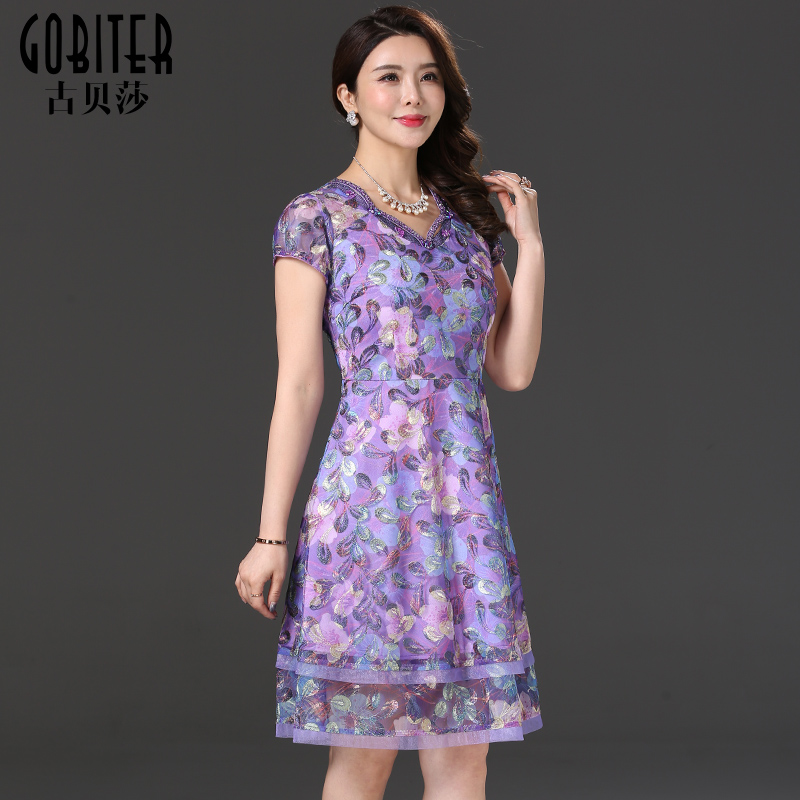 网纱刺绣高端印花钉珠显瘦妈妈短袖 新品 连衣裙 夏装 古贝莎女装