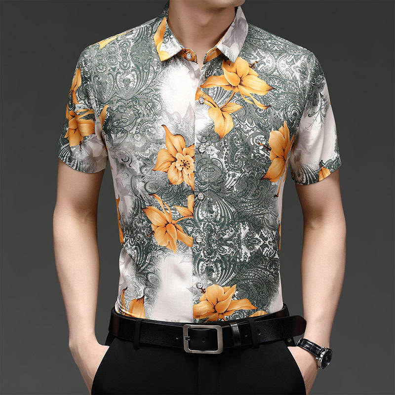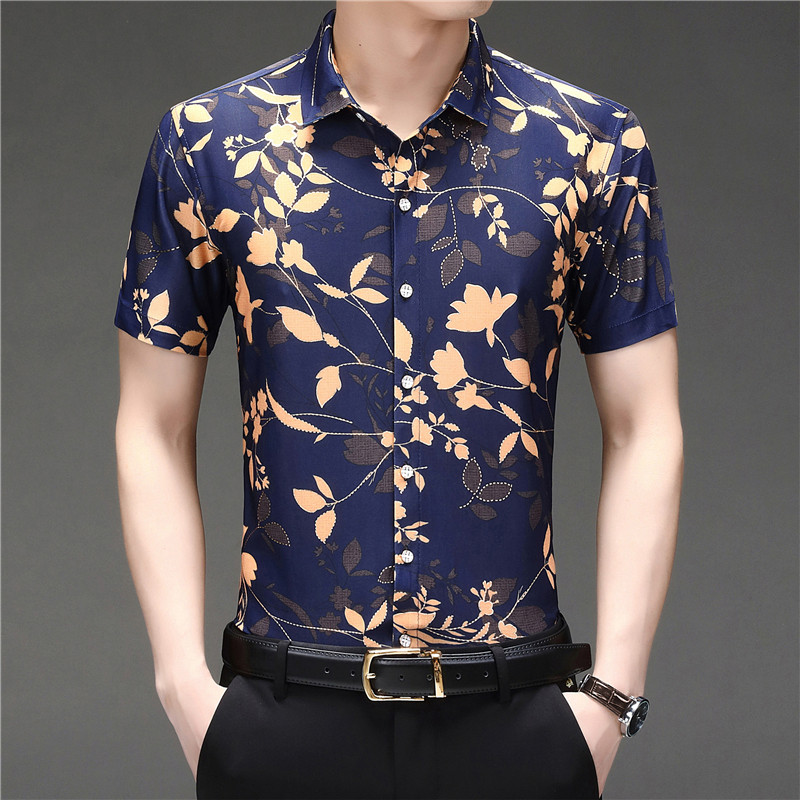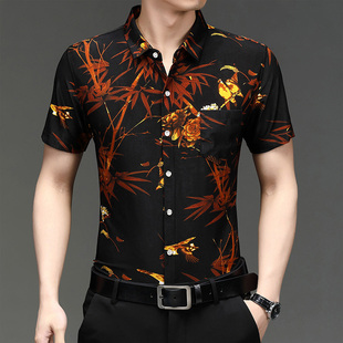 印花 九五狼大码 时尚 男士 冰丝衬衣爸爸装 衬衫 免烫碎花短袖 短袖