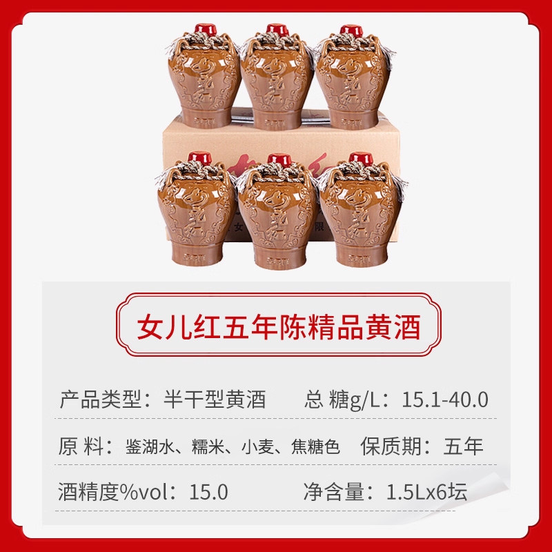 绍兴女儿红黄酒五年陈精品黄酒1.5LX6坛装 糯米酒 花雕酒18斤整箱装