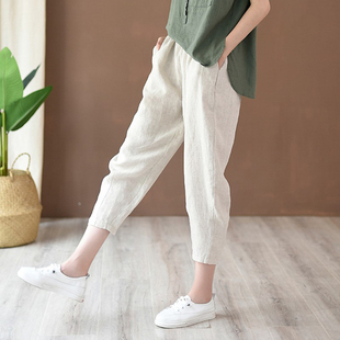 女百搭夏季 沙滩度假萝卜裤 新款 薄款 文艺简约显瘦哈伦裤 棉麻七分裤